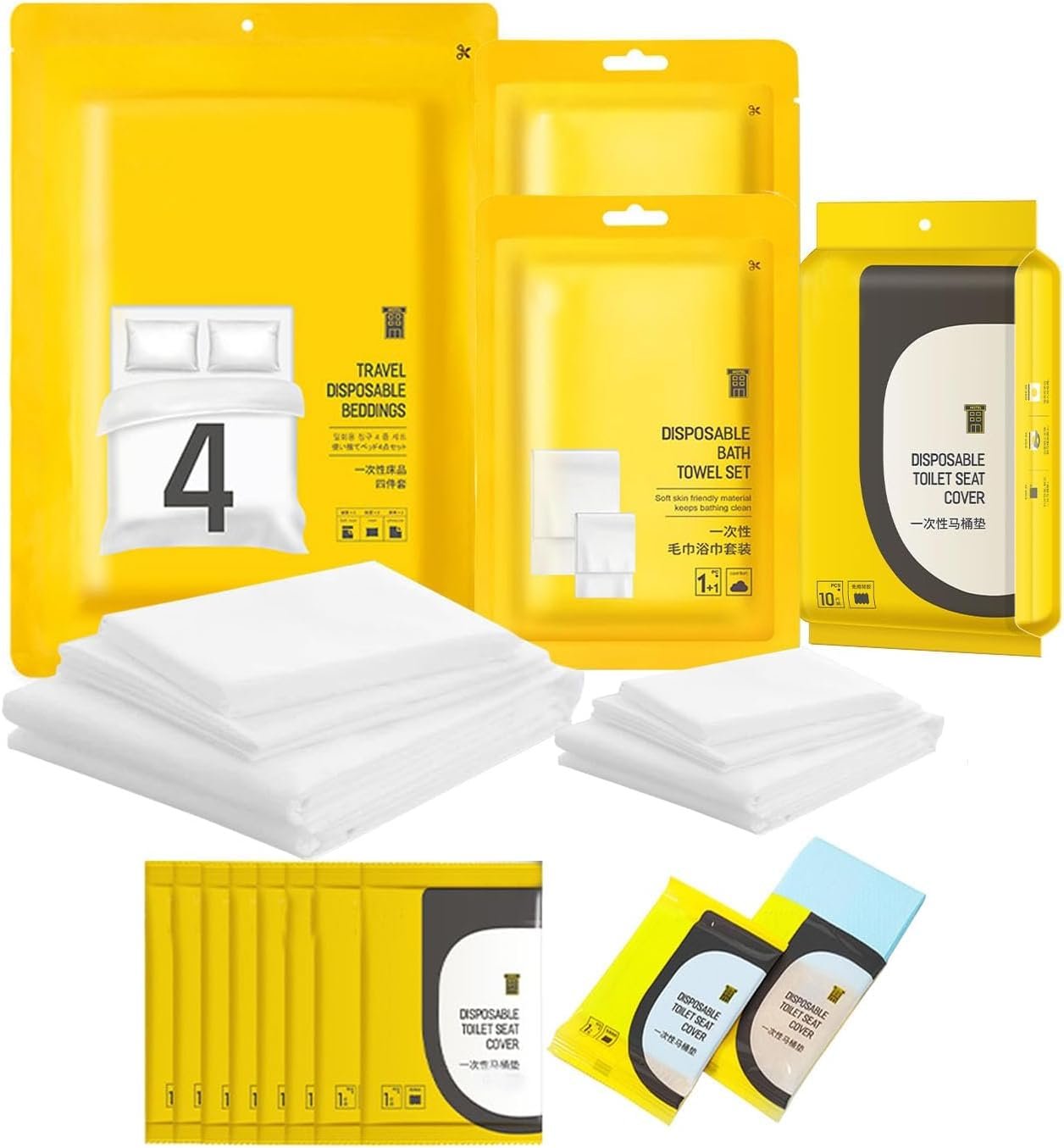 Disposable Travel Bedding Set,Economical,Soft and Comfortable.Make Your Travel More Safe! Disposable Bed Sheets Set Includes: 1x Large Size Disposable sheet (86.6 “x 94.5”) 1x Large Size Disposable duvet cover (86.6 “x 94.5”) 2x Disposable pillowcases (31.5 “x 19.7”) 2x Disposable face towel(11.8 “x 19.7”) 2x Disposable bath towel(31.5 “x 19.7″) 10x Disposable toilet seat cover (18″x 15.7”)