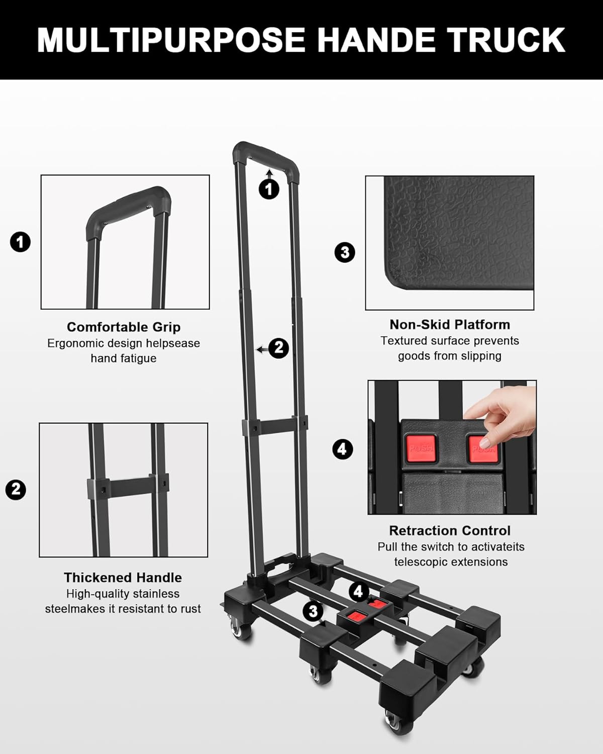 ADJUSTABLE HANDLE: The telescopic handle of the moving dolly has 3 heights that can be switched at will and the angle of the handle can be adjusted between 90° and 150°. The bar of the folding hand trucks is made of high-quality aluminium alloy and can be adjusted in height by pressing the handle button.