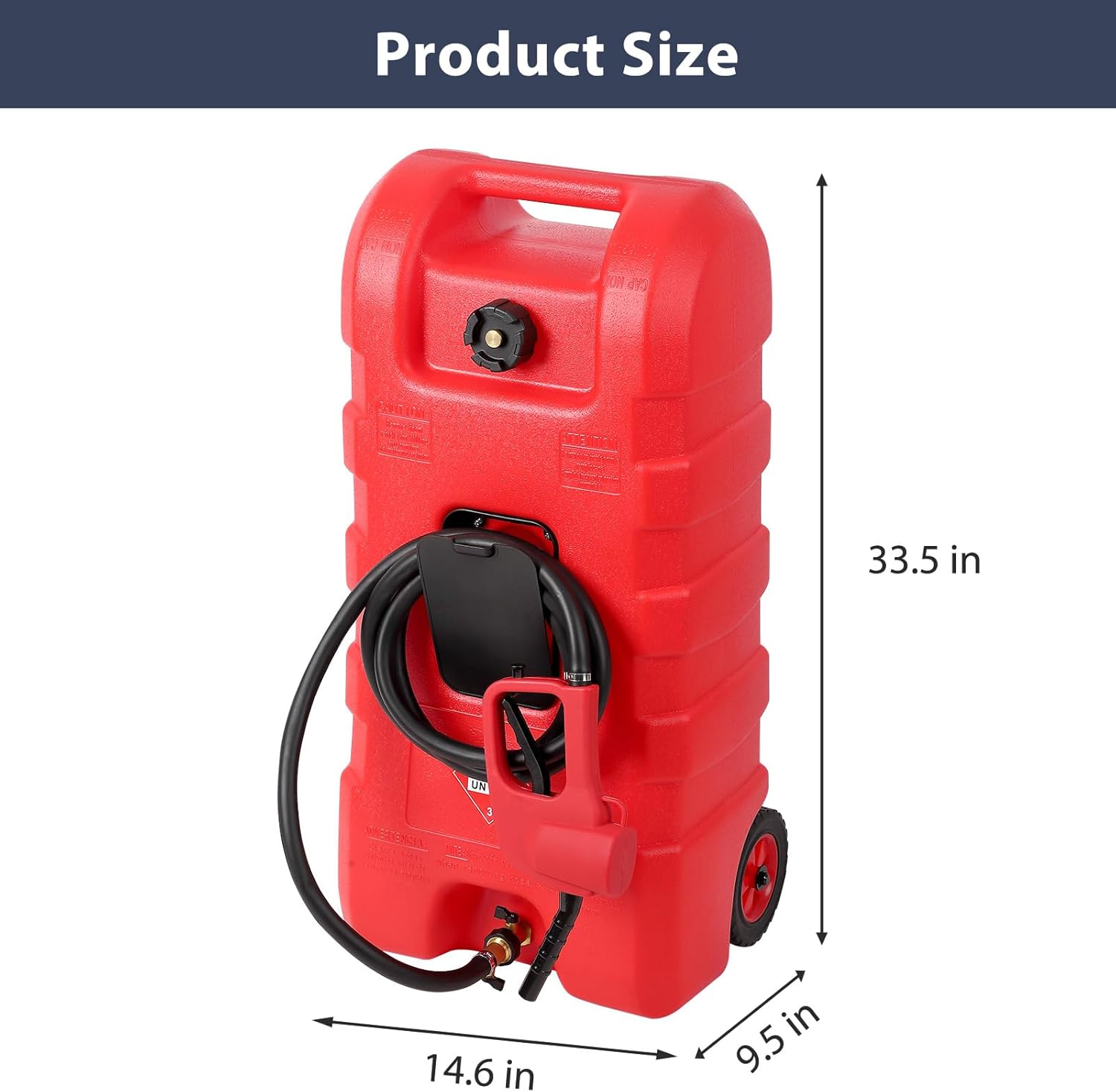 【Easy to Carry & Transport】The fuel can comes with two sturdy 6-inch wheels and a molded top handle making it a breeze to maneuver the tank over rough terrain and easily transport it from dock to small fishing boats, dinghies, and other small vessels. Pick it up with the top handle and take it anywhere.