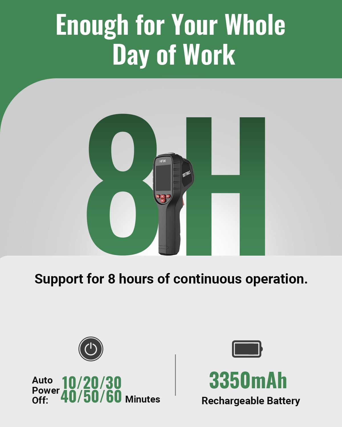 【Durable and Sturdy】 (1) Built-in rechargeable battery provides up to 8 hours of continuous operation. (2) Built-in flash memory can store approximately 30,000 standard thermal images. (3) The 6.6ft drop test and IP54 protection rating allow you to work with confidence in most different work scenarios and even harsh environments. (4) Designed with a standard tripod hole, HF96 thermographic camera supports using a tripod to assist inspection works.