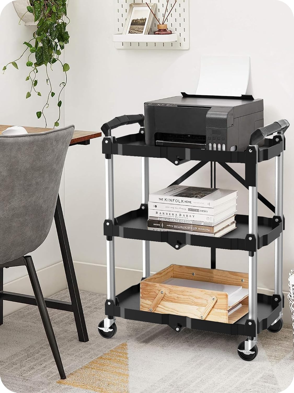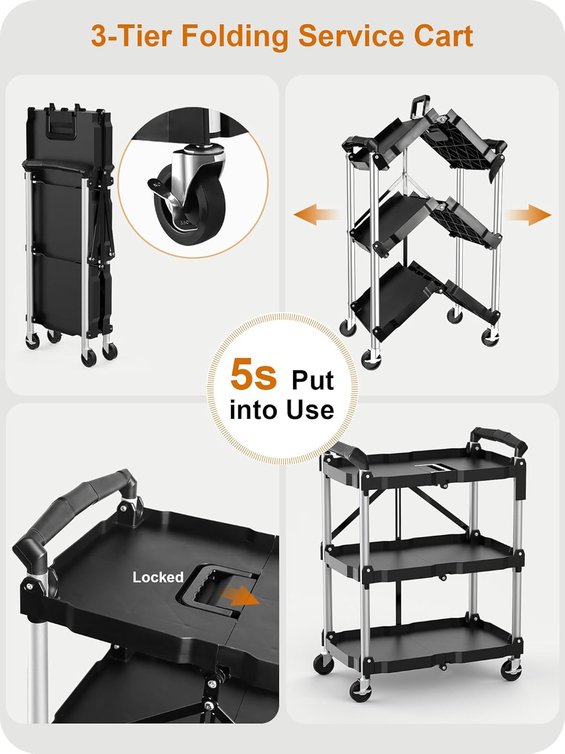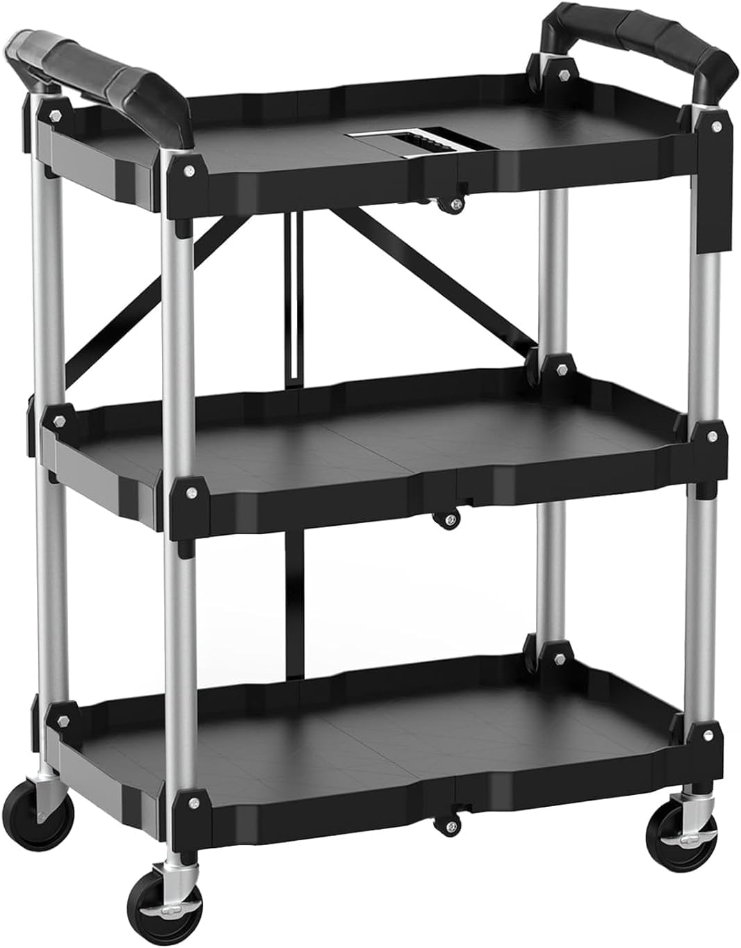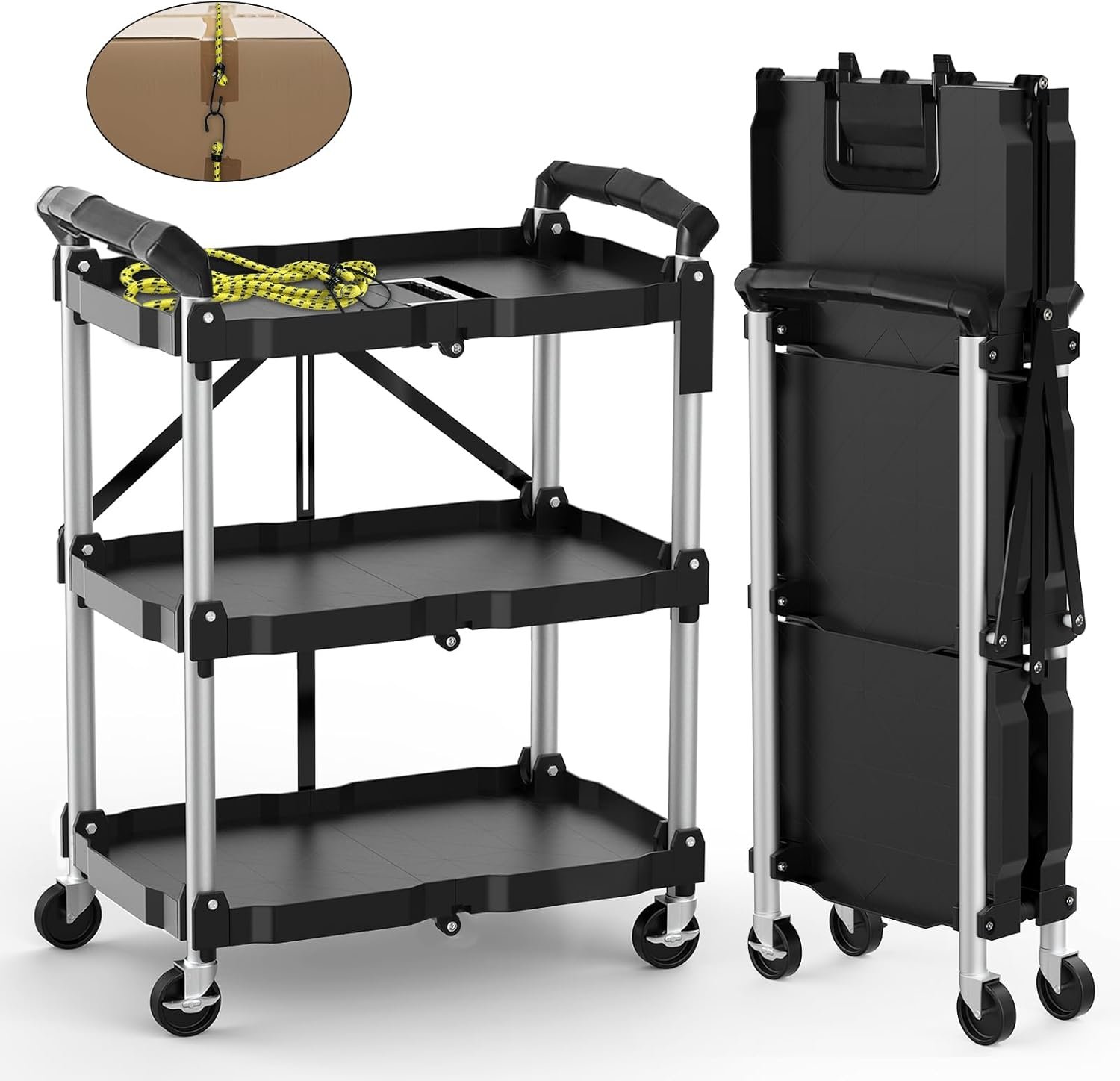 HIMIX Foldable Utility Carts with Wheels, 3-Tier Holds 240lbs Folding Rolling Cart with Fixed Rope, Collapsible Service Cart for Home, Office, Garage, and Warehouse – No Assembly Required