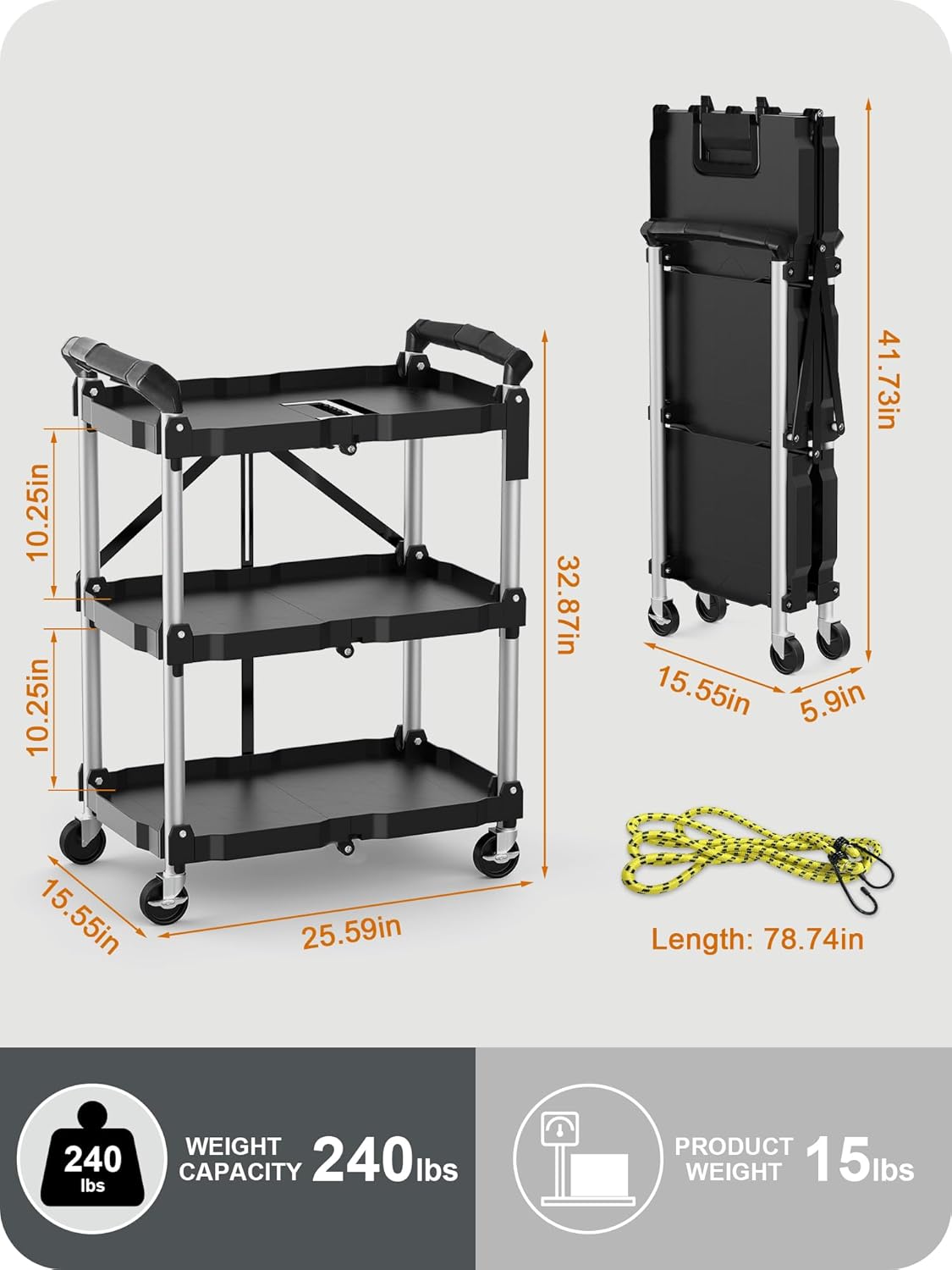 Secure Grip: Equipped with a 78.8″ durable rope, our folding cart with wheels securely holds your items in place, preventing slips.