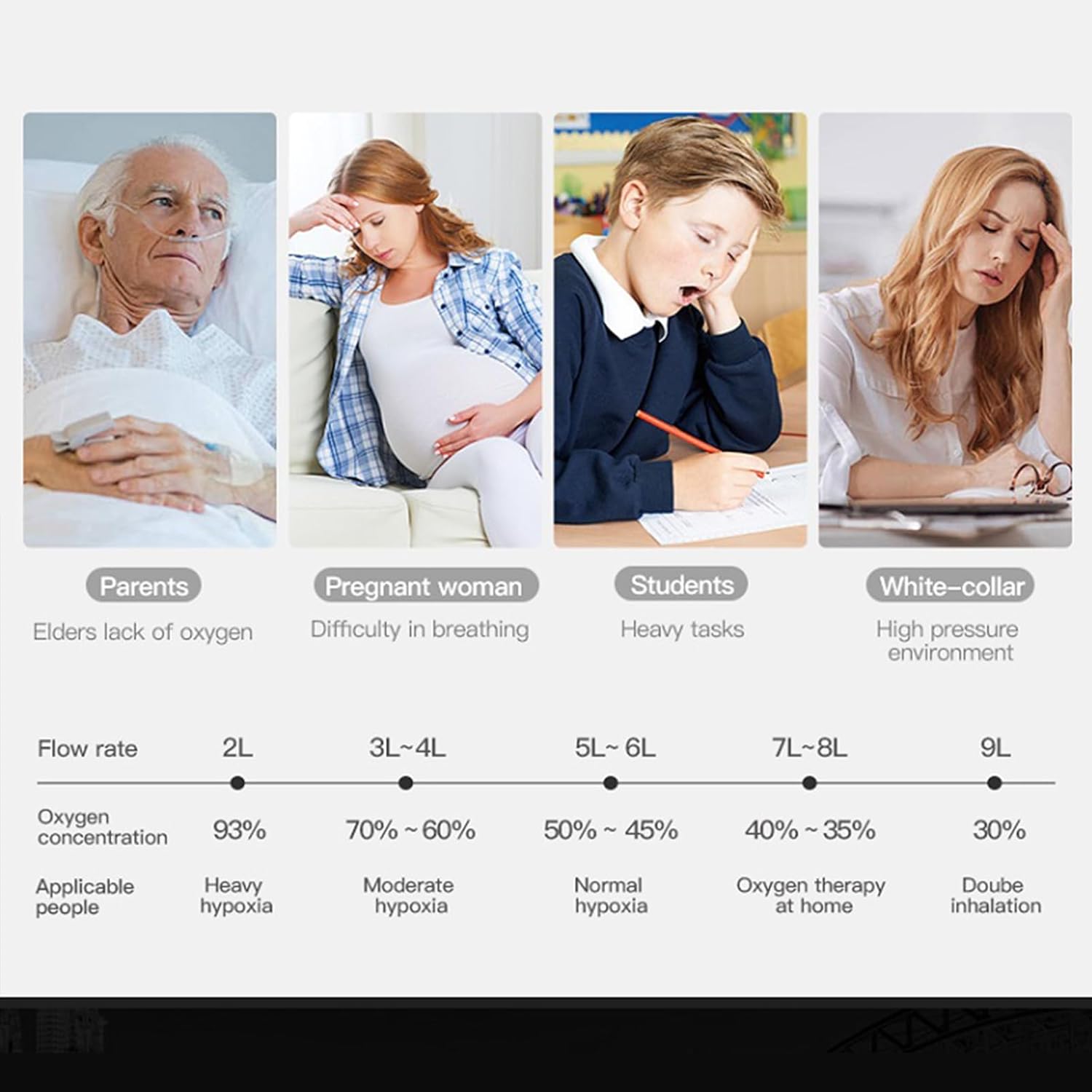 User Group: Our oxygen concentrator is suitable for use by the elderly, office workers, pregnant women, students, children, etc. Mostly used at night, if needed during the day.