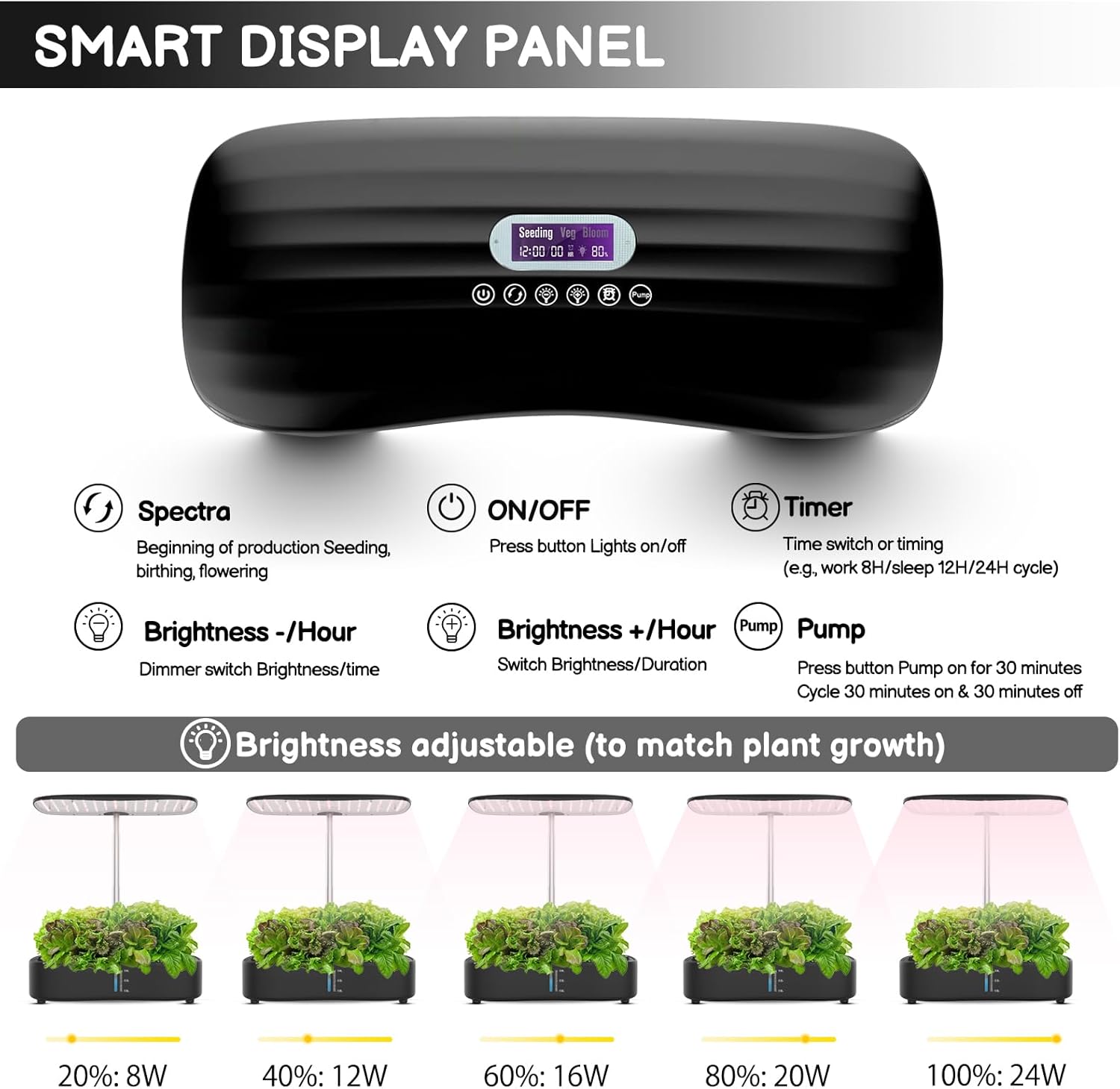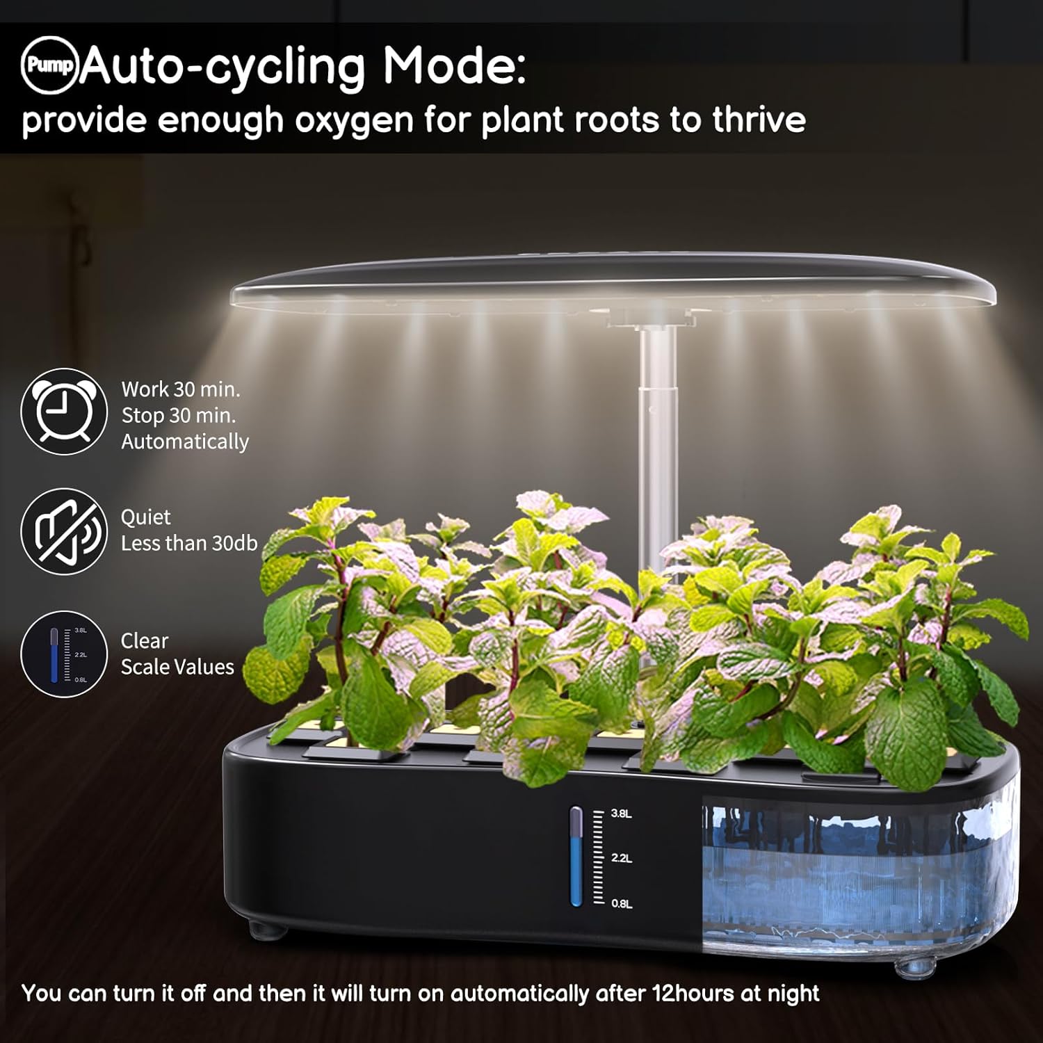 Smart Quiet Water Pump:This hydroponic growing system kit is equipped with a smart water pump that is super quiet (less than 30 dB), creating an excellent environment for plant roots to thrive. Auto-cycling Mode: 30 minutes on, 30 minutes off for energy savings. You can turn it off, and it will automatically turn on after 12 hours at night.
