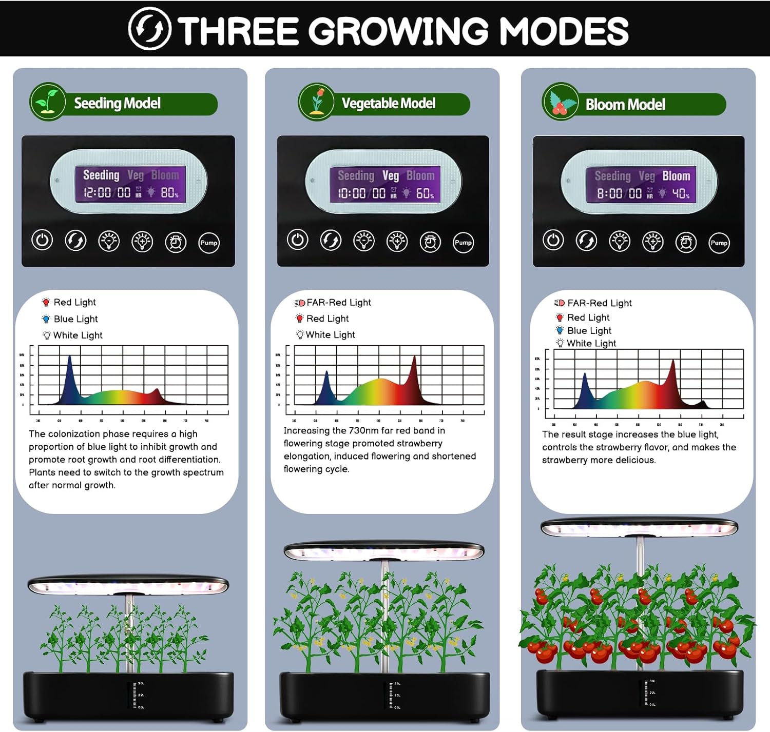 Smart 3-Mode Lighting System: The 24-Watt LED light automatically adjusts, mimicking the sun’s spectrum to optimize photosynthesis regardless of the weather. Choose from Seeding Mode or Vegetable/Bloom Mode , tailored to your plants’ specific needs.