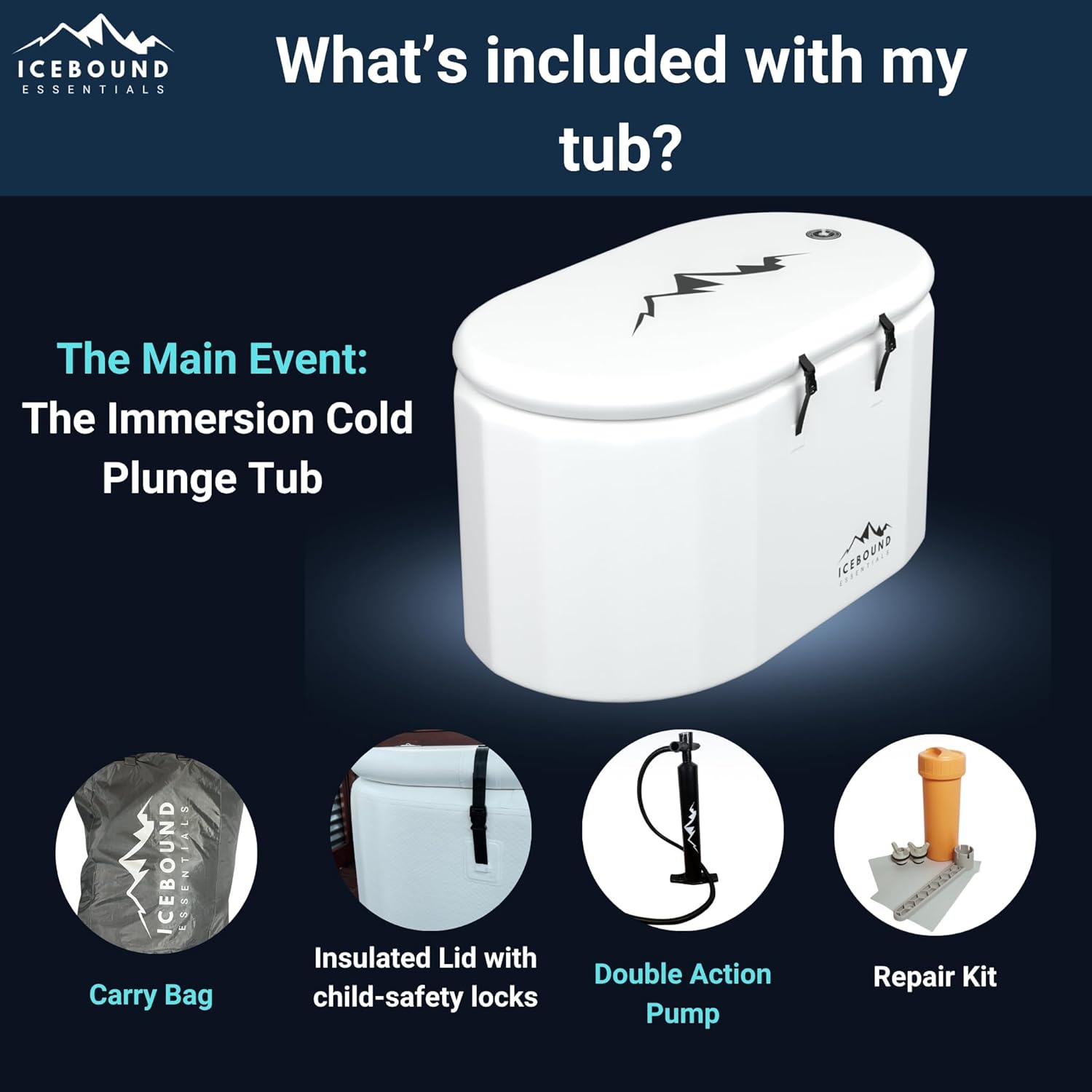Complete Package: Your Immersion tub comes with everything you need for a premium cold plunge experience, including an insulated lid with secure child locks, pump, carry bag, repair kit, quick dry mat, and connection points for water chillers (sold separately).