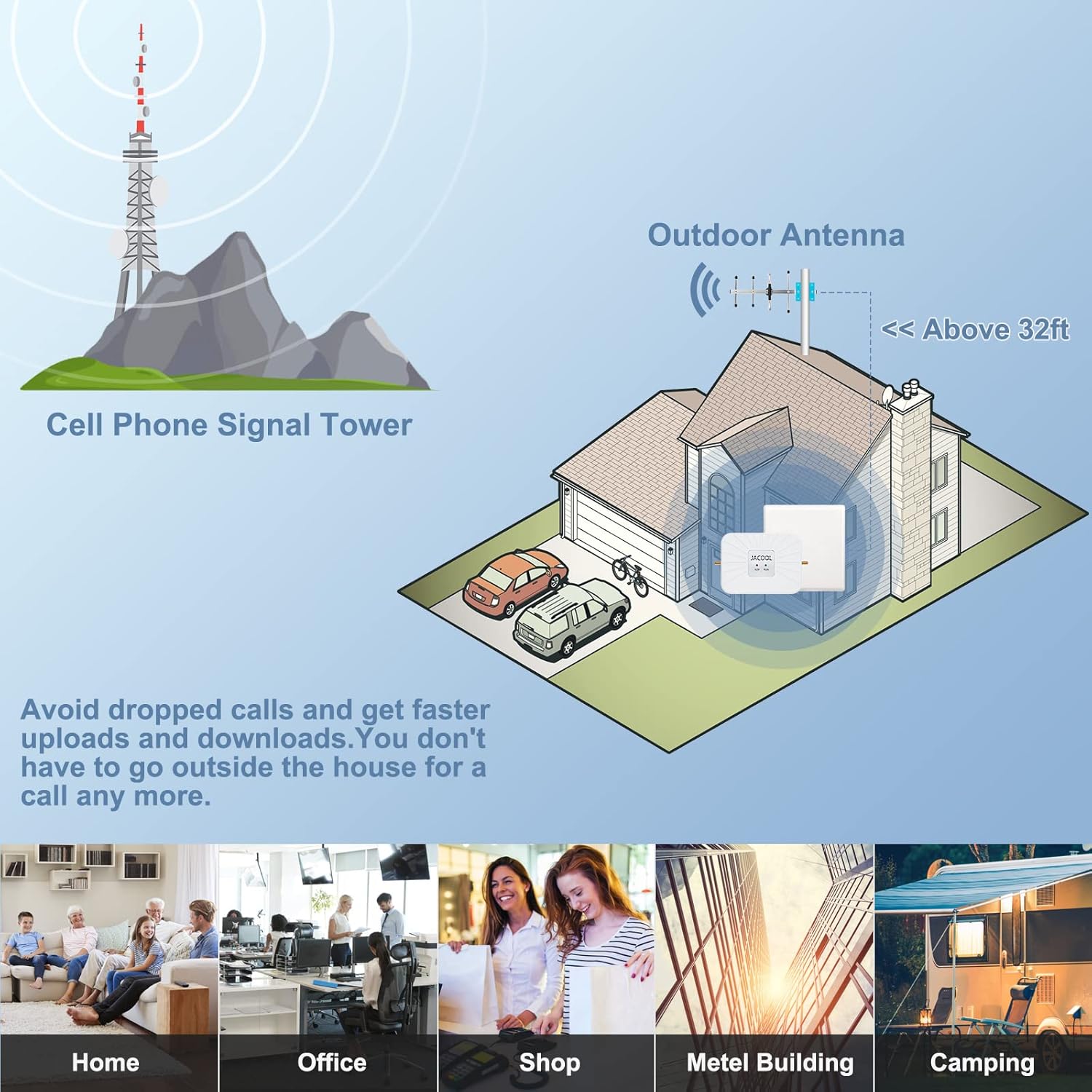 JACOOL cell phone signal boosters work with Verizon Straight Talk 5G 4G LTE Band 13 network frequency, Uplink:776MHz-787MHz,Downlink:746MHz-757MHz. Cell Phone Signal Booster for Home compatible with IOS, Pad, Android, WiFi hotpots, Windows Phone Systems. Signal booster for cell phone at home offer higher audio quality, faster data and streaming in your House, Village, Garage, Basement, Home, Office, Cottage, Cabin, Hotel, Apartment, Building, Warehouse, Metal housing, Camper etc, get rid of expensive monthly internet fees.
