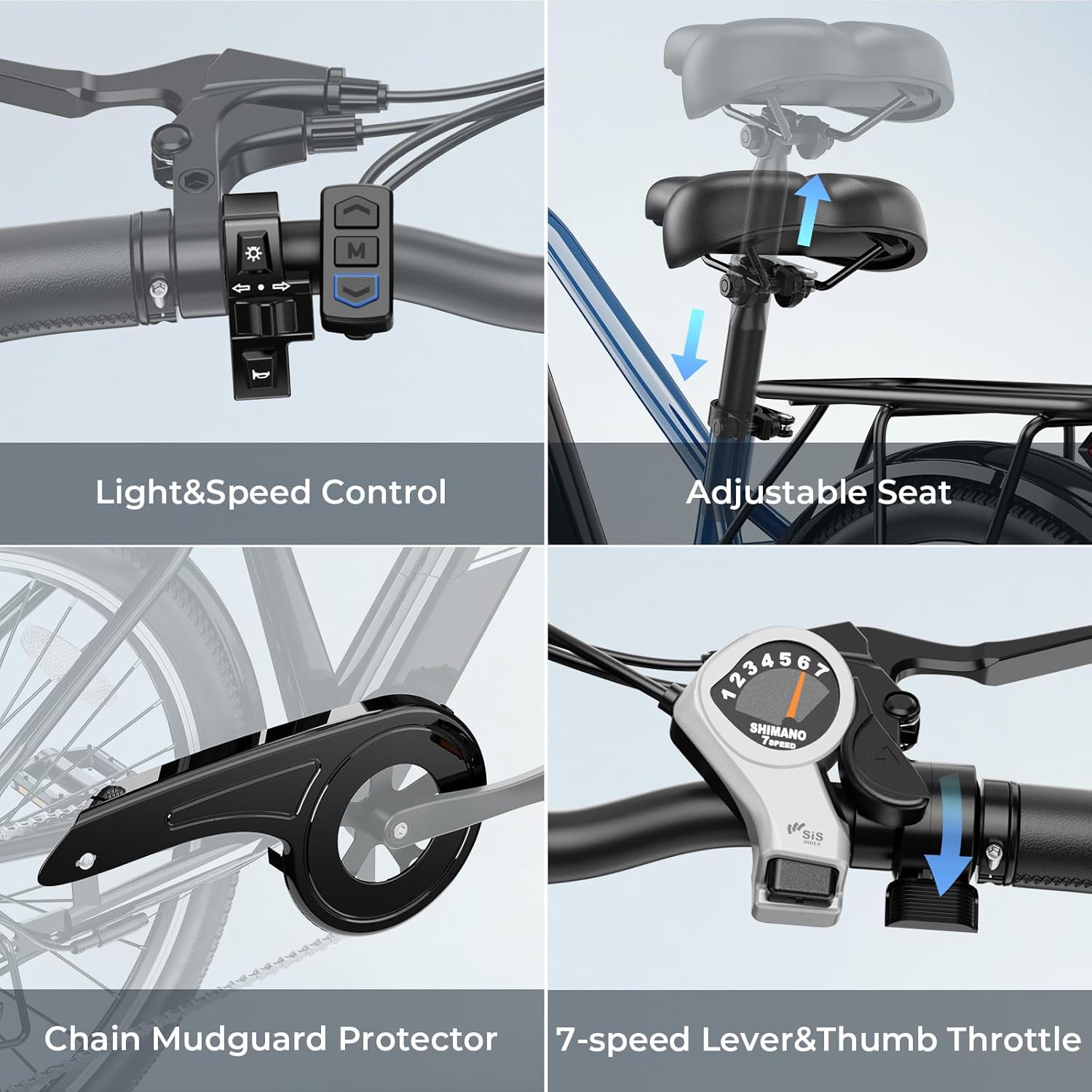 【1200W Peak Motor&Dual Mechanical Brake】-Jasion Roamer electric bike for adults is equipped with 750W(1200W Peak Motor) brushless motor.The powerful motor enables speeds of up to 28MPH.Whether road, grass, sand or mountain,this city cruiser ebike can conquer all terrains and is one of your best essential travel choices.The front and rear mechanical disc braking system can provide powerful braking capabilities and precise instant braking speed, ensuring your safety at all times.