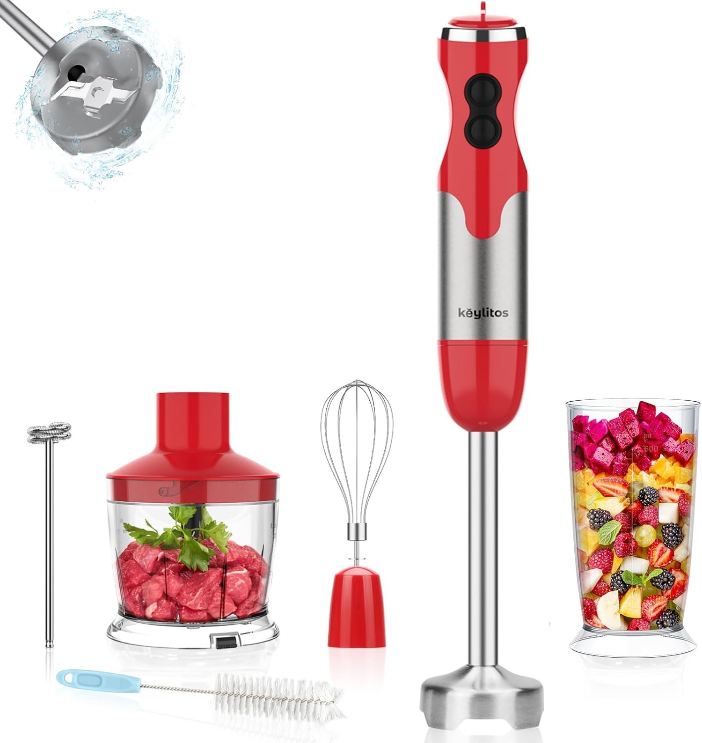Keylitos 600ml Red Hand Blender with 5-in-1 Attachments, Turbo Boost and Adjustable Speed Control