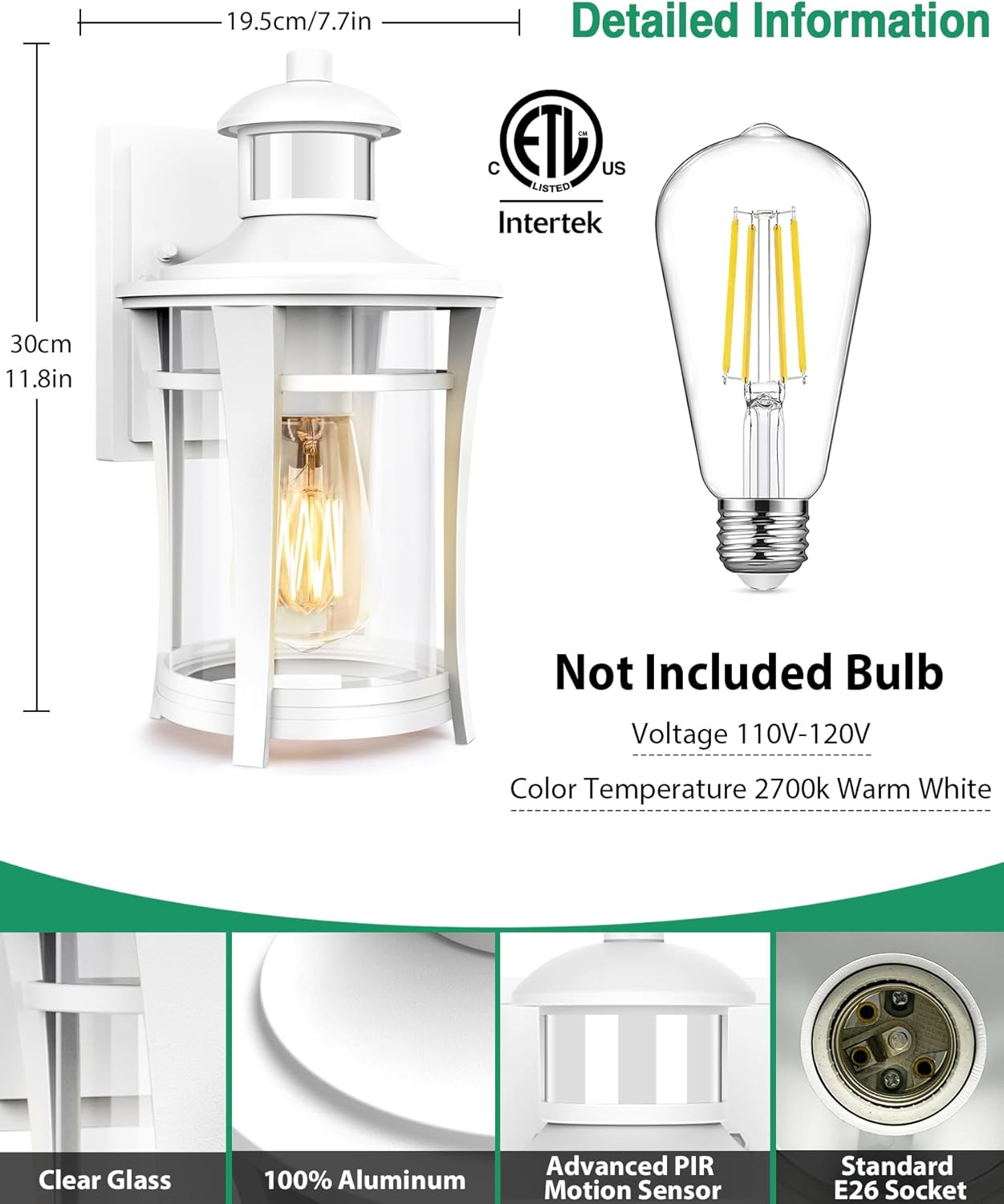 【Weather Resistance & Wide Application】 Our motion sensor wall lights are constructed with heavy-duty rugged high-quality aluminum and clear seeded glass panels, Delicate workmanship, Even in cloudy/heavy rain/snowy/icing/hot weather, etc. This motion sensor wall lantern will not get rusty or corrosion after years of use. No glue on inner seams with its classic black finish complements any decoration making it the ideal piece for all your outdoor lighting needs.