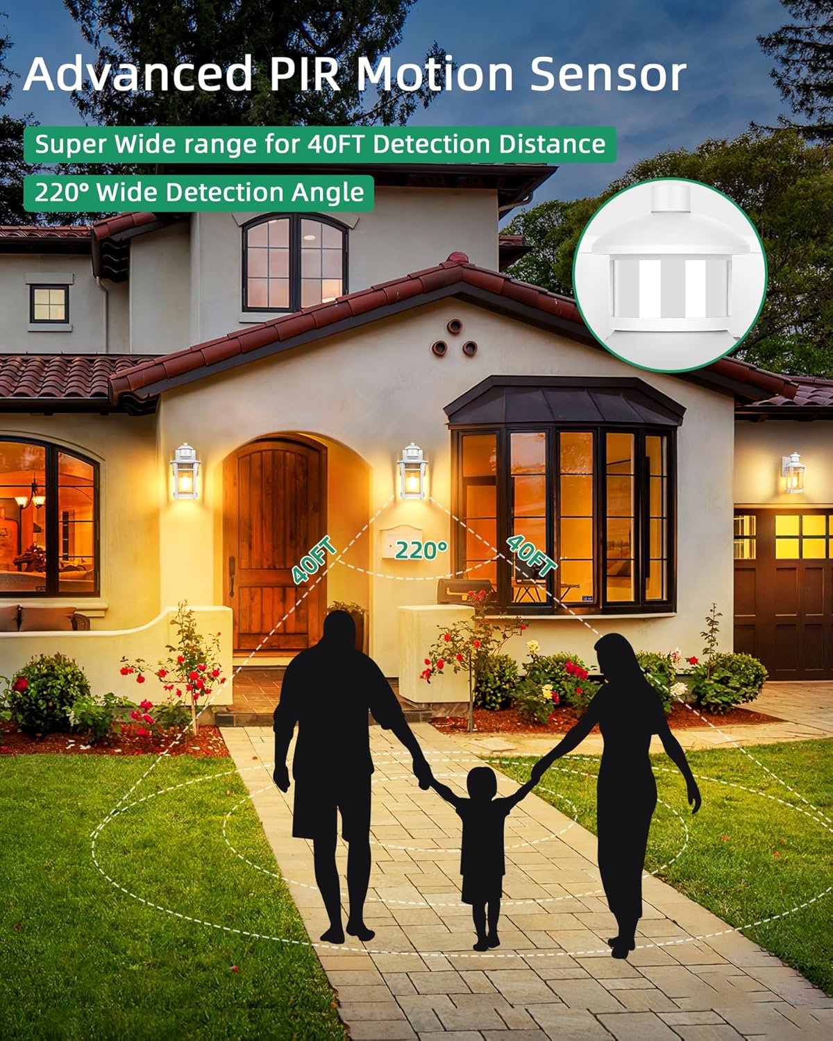 PIR Motion Sensor】Our outdoor sconce is an innovative technology developed over 6 years with 3 lighting modes(PC, Auto, Auto+) to choose from. You can set the sensor distance of the motion sensor (0-40ft), illumination time (20s-180s), and dim light brightness to 0%-50%(only in Auto+ mode). This innovative technology can meet a wide range of needs and improve user satisfaction, making it easier to use.