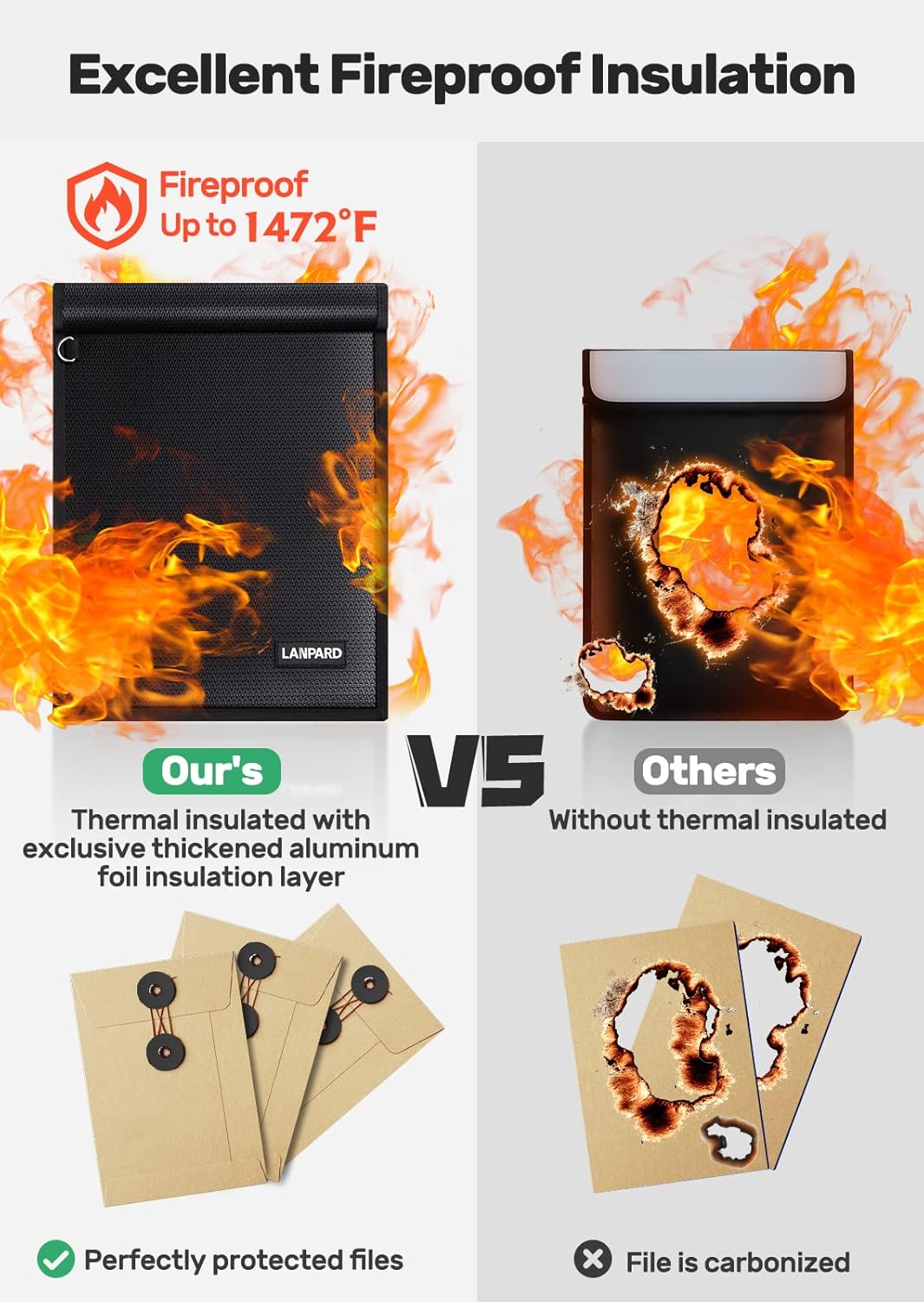 [EXTRA LARGE CAPACITY EMP BAGS FOR ELECTRONICS]: Our fireproof and waterproof faraday pouch offers multiple protection against hacking, water, and fire damage. The unique thick aluminium foil layer in faraday pouchs provide insulation and enhances fire resistance, while the flame-retardant fabric for the edging further fortifies its fire resistance capabilities. Our faraday cage will keep your valuables 100% safe.