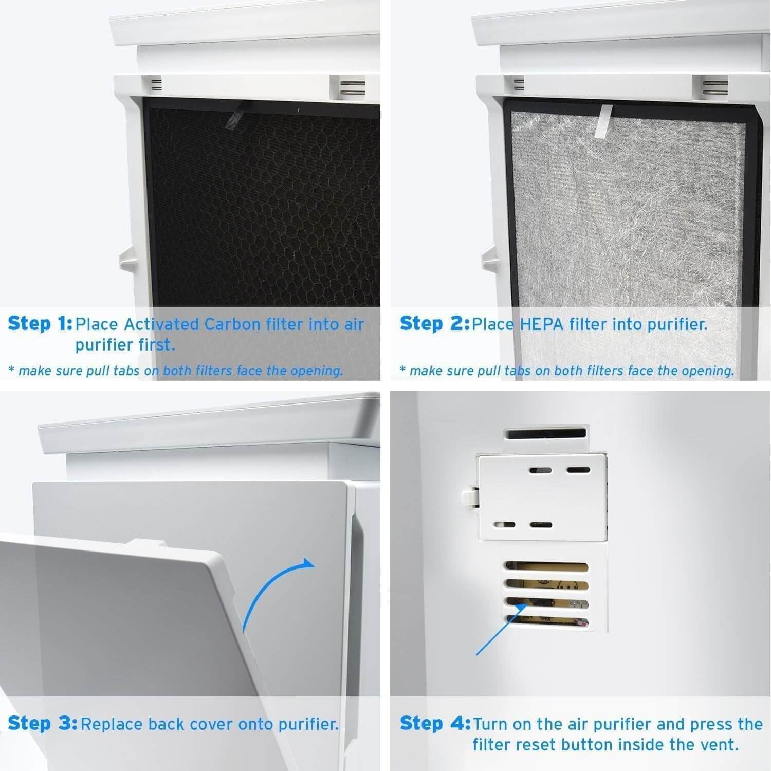 Genuine Levoit Replacement Filter Designed specifically for the Levoit LV-PUR131 & LV-PUR131S, these certified Levoit brand replacement air filters allow you to keep producing fresh air for your home. Replacing the Air Filters To replace your the air filters in your LV-PUR131 or LV-PUR131S air purifier follow the steps below: 1) With the air purifier off, unplug the air purifier and remove the back cover 2) Remove the old air filters and properly dispose of them 3) Unwrap the new air filters. Place the Activated Carbon filter inside the housing first, making sure the pull tabs are facing the opening 4) Install the True HEPA filter into the housing; make sure the pull tabs are facing the opening. 5) Replace the back cover onto the housing 6) Plug in and turn on the air purifier. Use a pen or a pencil to press the black reset button inside the vent on the side of the air purifier. The “Change Filter” symbol should now be off. Be sure to also clean the dust sensor on the side of the air purifier using a clean cotton swab.When Should I Replace My Filters? The air filters can be used for up to 6 months, depending on how often your air purifier is used. If you need additional help, feel free to reach out to our helpful Levoit support.Package Contents 2 x Fine Preliminary /Efficient Middle Filter 2 x Activated Carbon Filter