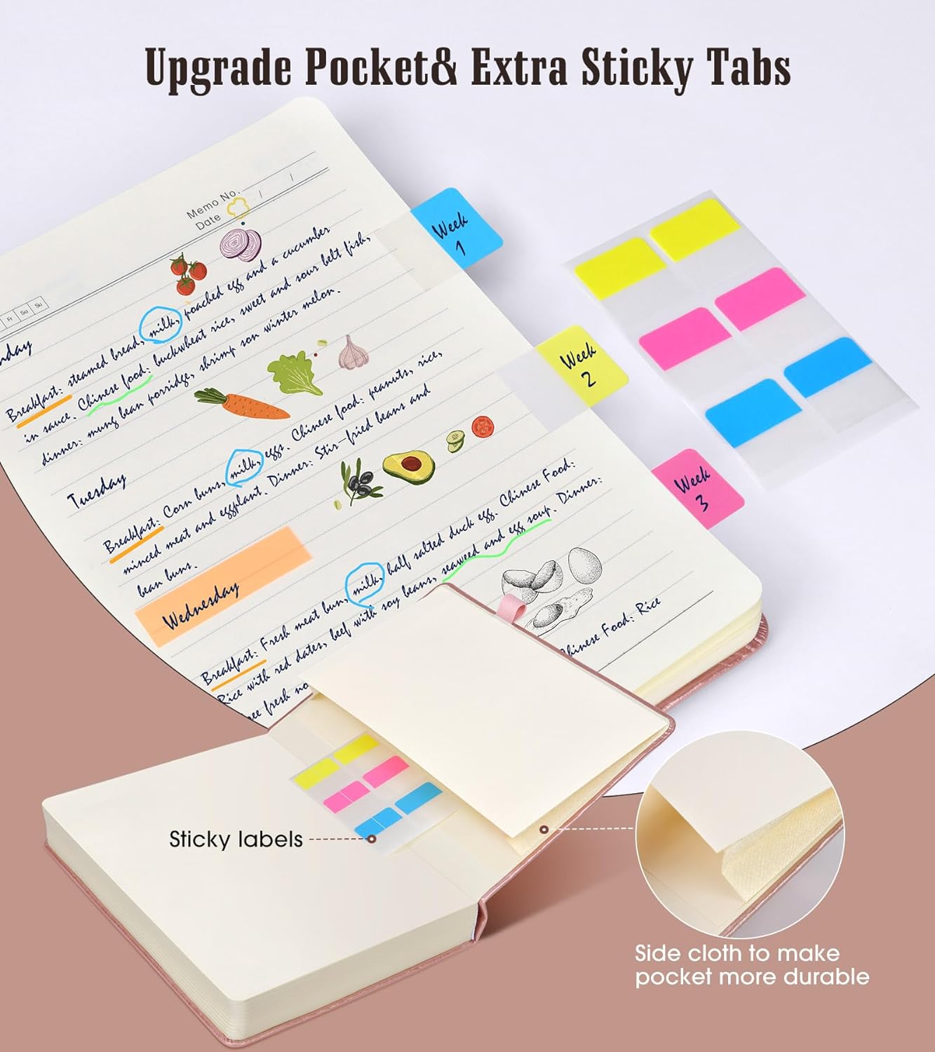 【Upgrade Lined Journal Notebook】Comes with 1 elastic closure band & 1 elastic bookmark band, more stable. An expandable inner storage pocket to keep track of appointment cards,notes,receipts,and more. 1 gift of multicolor index tabs stickers for papers classifying and marking.