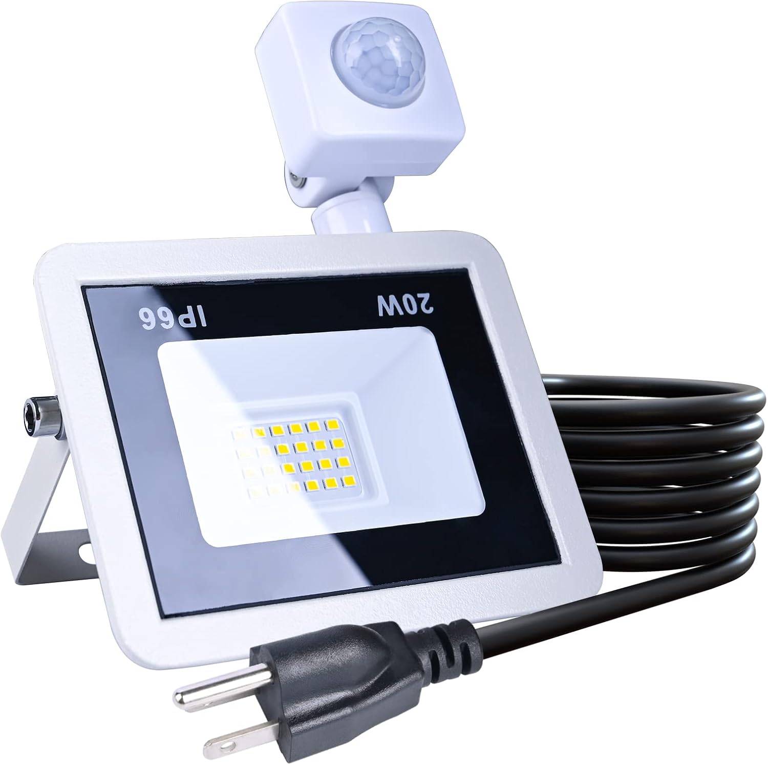 WATERPROOF:The plug-in LED motion sensor floodlight reaches IP66 waterproof rating. Therefore, it can withstand rain and snow well. It can be installed on patio, garage, porch and stairs.