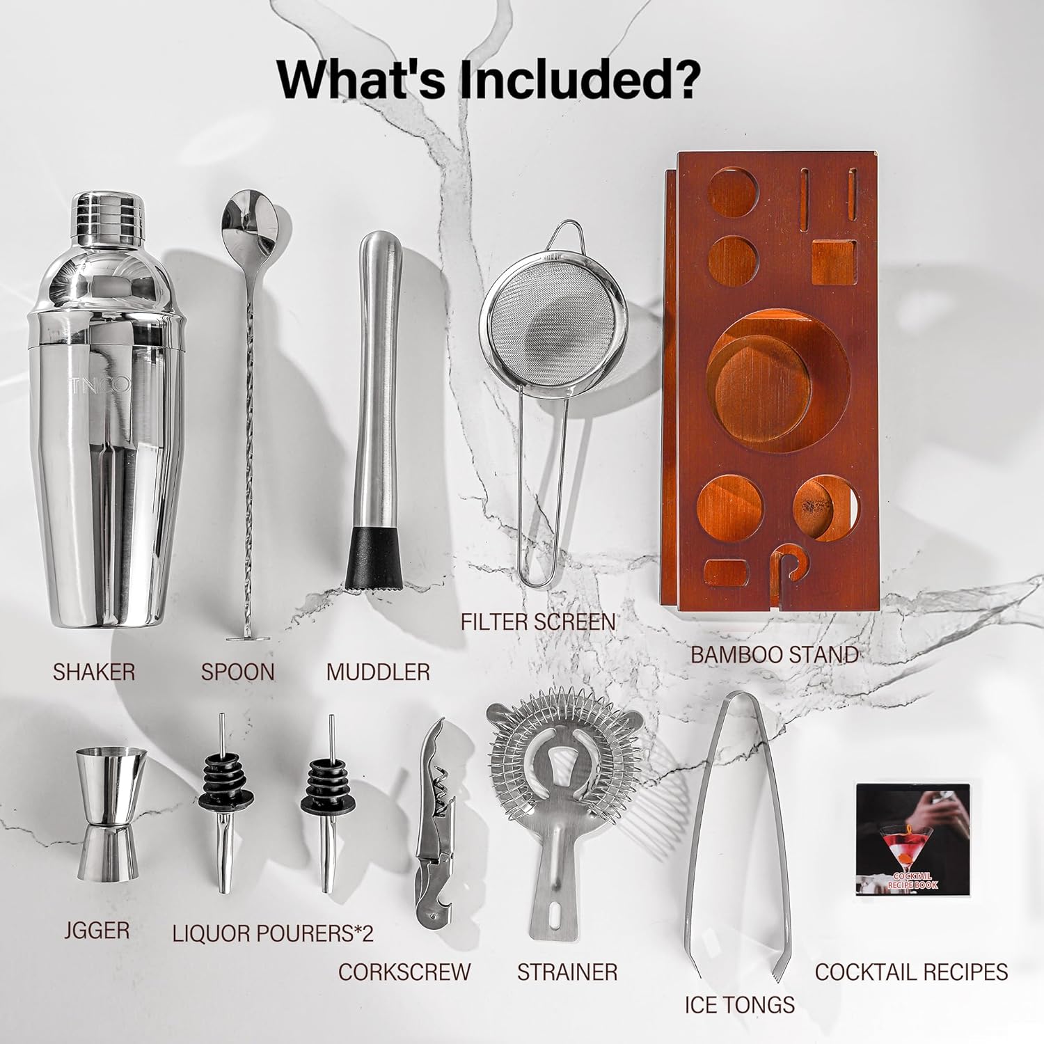 Mixology Bartender Kit Cocktail Shaker Set: 10-Piece, Bar Tools with Wooden Stand, Bar Set with All Essential Accessory Tools: Martini Shaker, Jigger, Strainer, Mixer Spoon, Muddler Ect, (Silver)