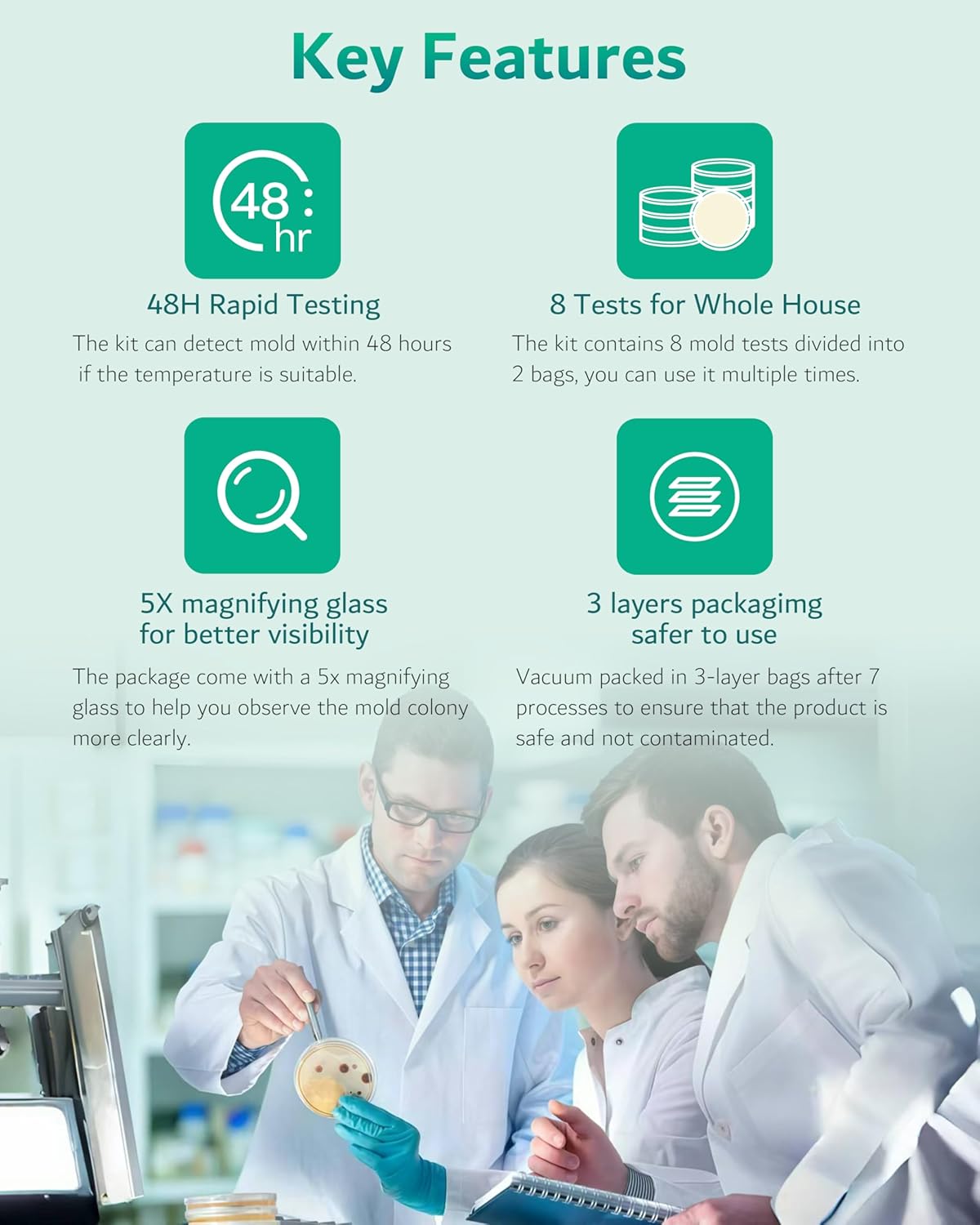 【𝗪𝗵𝘆 𝗖𝗵𝗼𝗼𝘀𝗲 𝗢𝘂𝗿 𝗠𝗼𝗹𝗱 𝗧𝗲𝘀𝘁 𝗞𝗶𝘁】The rapid proliferation of mold can lead to respiratory issues for many individuals. Our At home mold test kit allows for quick and easy detection of potential mold areas in your house. Once the mold type is identified, you can promptly clear it and maintain a healthy, mold-free living space.
