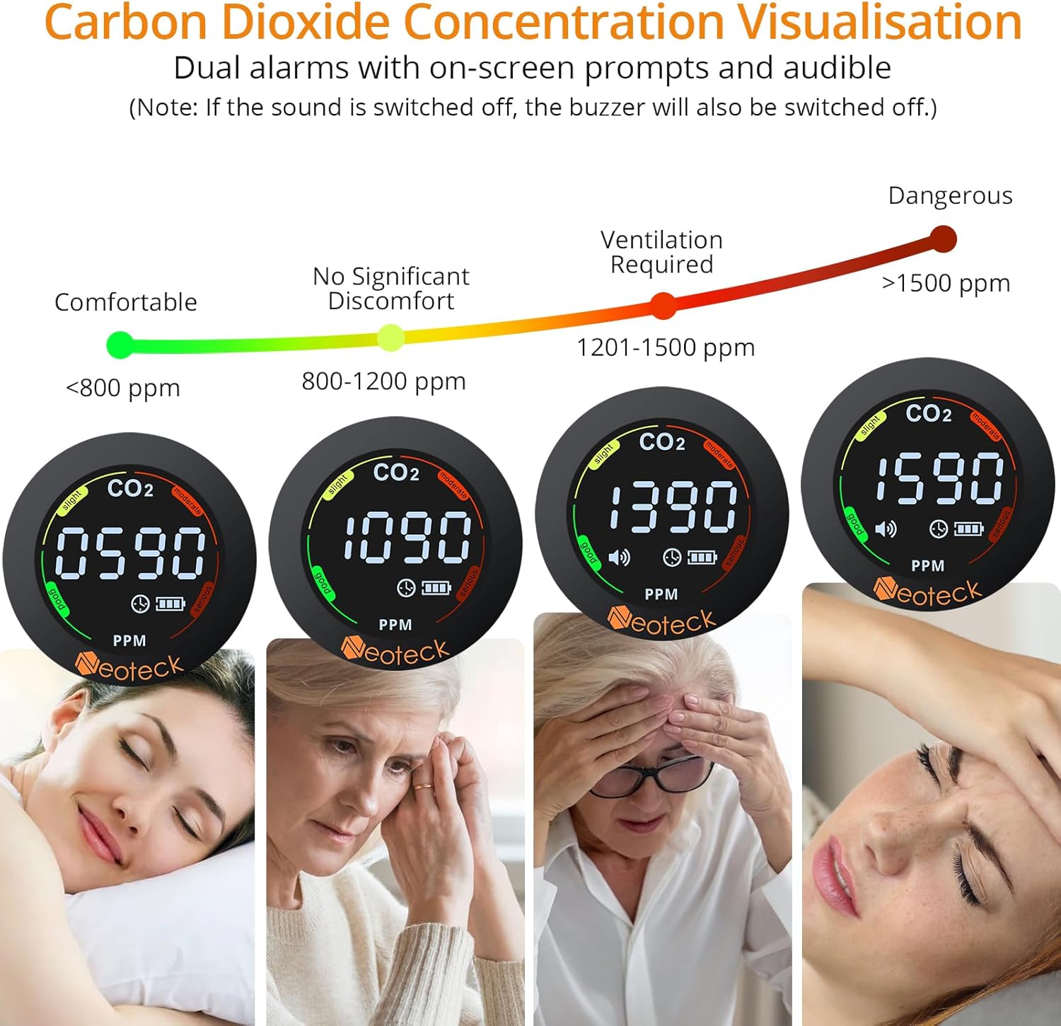 【Adjustable Brightness and Sound】Neoteck carbon dioxide alarm also features brightness and sound adjustment functions. You can choose from 3 screen brightness levels: dark, moderate or brightest according to your needs, ensuring you can see the display clearly in any lighting condition. Additionally, you can choose to enable or disable the sound. When the sound is turned off, all alarm sounds will also be turned off, allowing you to use it in a quiet environment without disturbing others