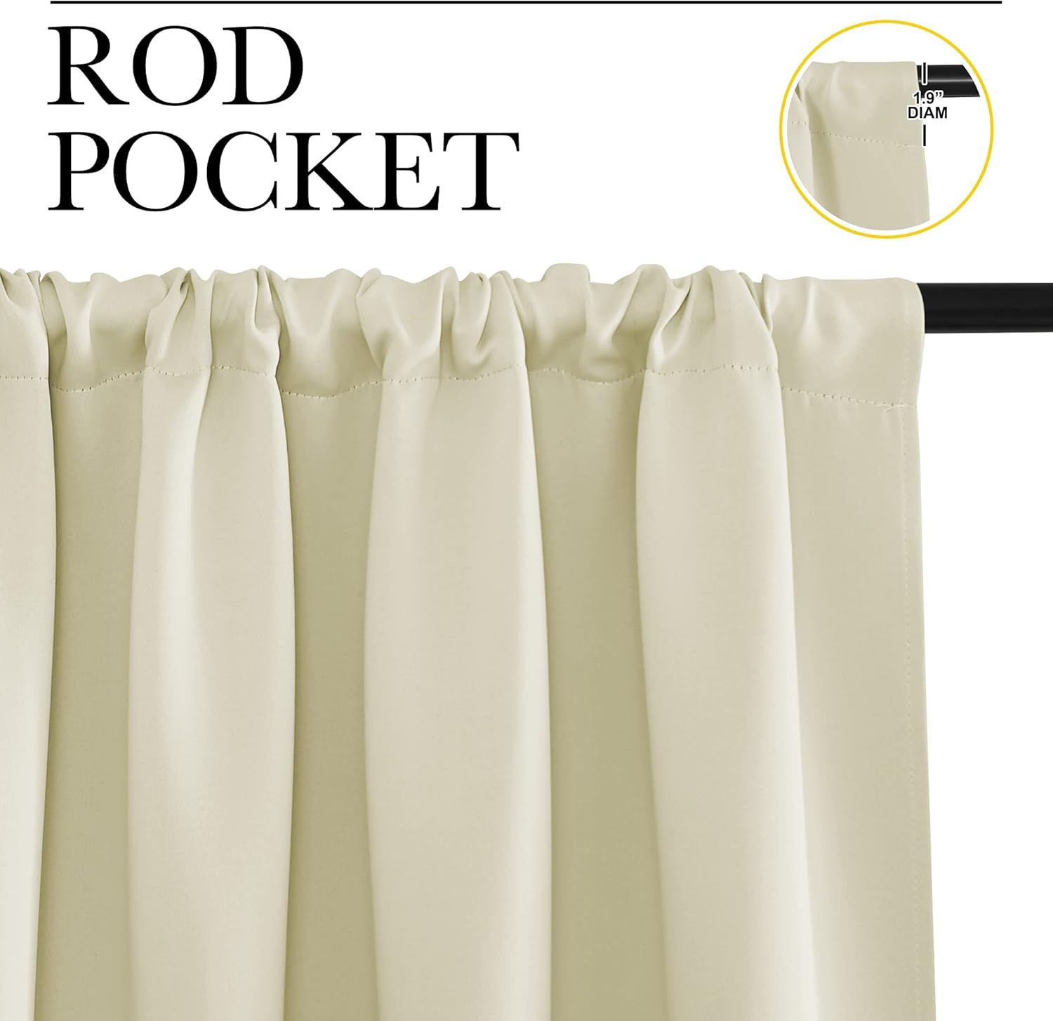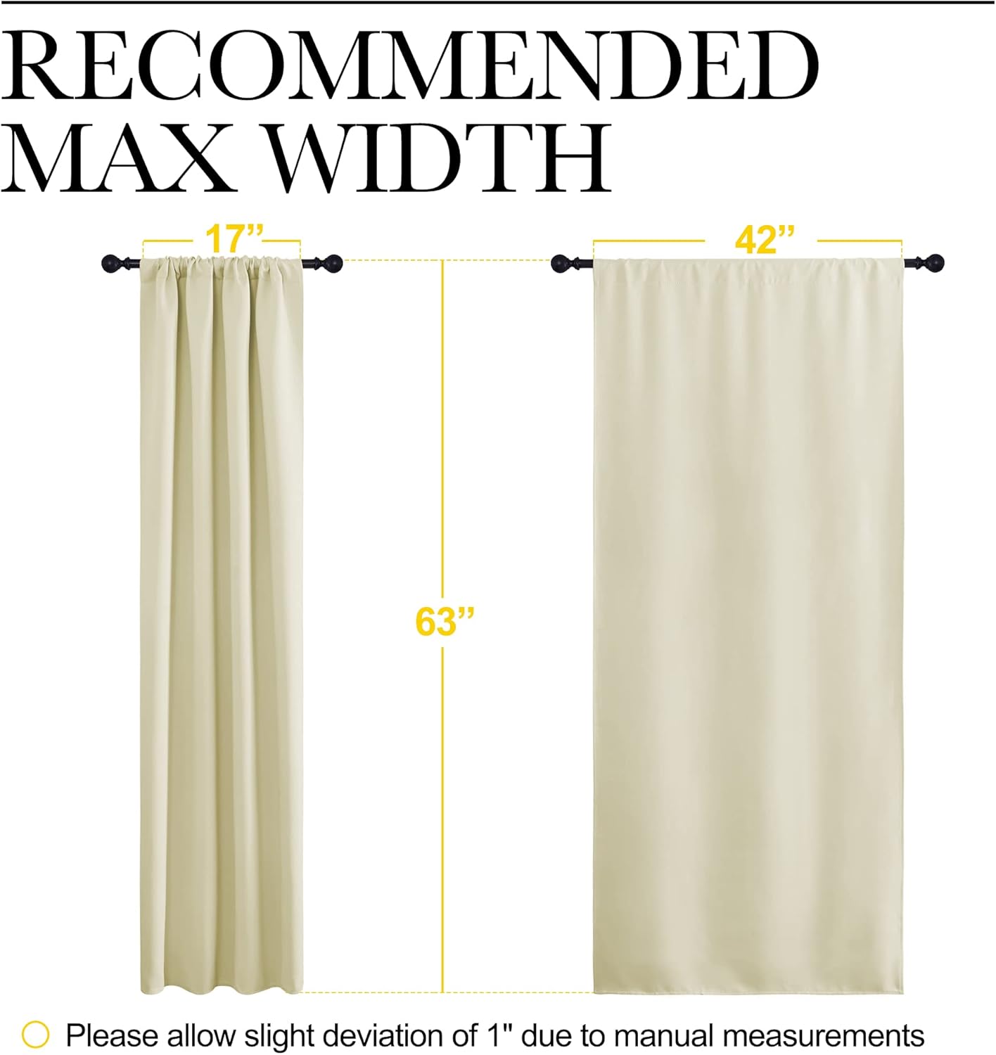 ELEGANT DESIGN: 2 panels per package. Each Blackout Curtain Panel measures 42 inches wide x 63 inches long. The NICETOWN drapery is constructed with rod pocket, fitting the curtain rod of your choice up to 2 inches in diameter, making the curtains easy to install and slide.