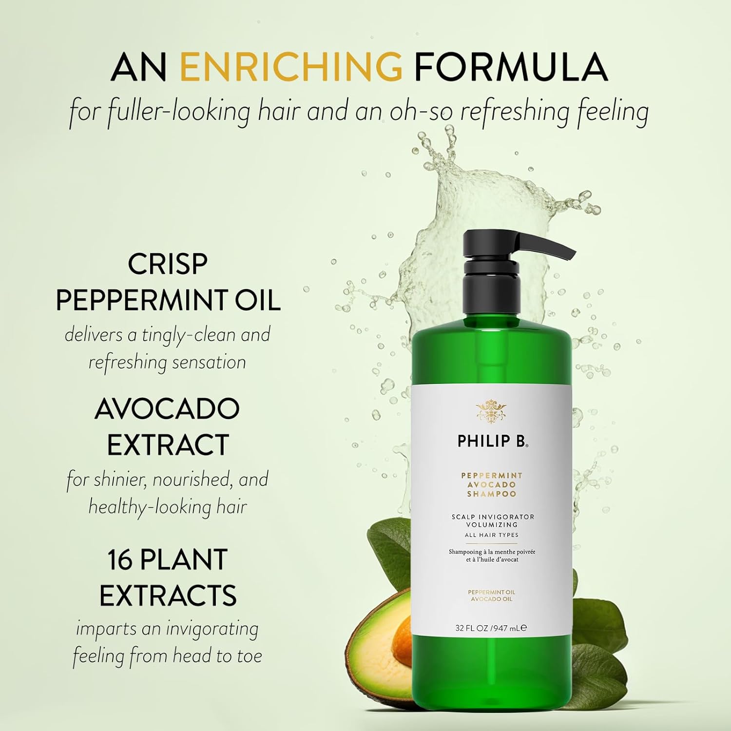 PHILIP B Peppermint Avocado Shampoo, 32 fl. oz. (947 ml) – Volumizing & Clarifying Shampoo for Dry to Oily Hair and Scalp, Non-Stripping