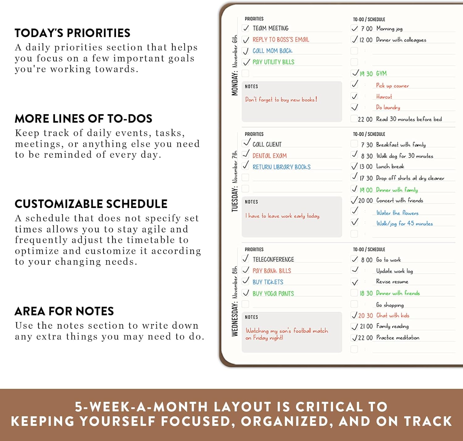 🎯 UNDATED PLANNER & CHART YOUR PROGRESS – This hardcover productivity planner is that it is undated, So unlike most dated planners, you can start using it at any time without wasting a page. Use weekly reflection templates, along with daily task lists, to connect the dots between your granular to-dos and your big-picture ambitions. With your priorities always in view, life’s daily demands won’t derail you, this keeps you moving toward success each day.