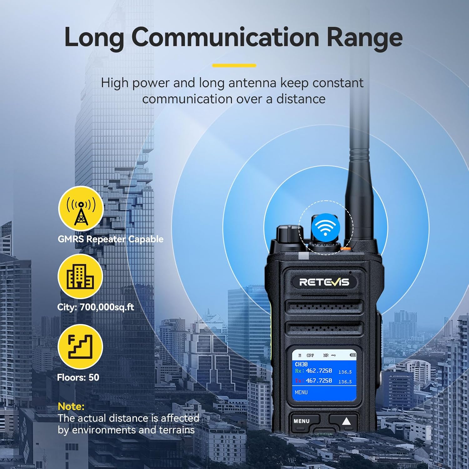 Walkie Talkies Long Range; urban areas with more skyscrapers tend to attenuate the communication distance; while the NR30S long distance walkie talkies is designed for this environment with high power output and high gain antennae; even in concrete buildings; it can also maintain long distance and clear communication; with a coverage area of up to 700,000 sq. ft. and a strong signal that penetrates up to 50 floors