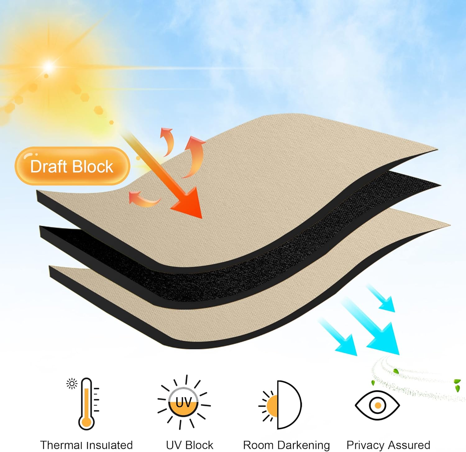 Added slide rail design for smoother sliding. Thickened polyester fabric can keep indoor temperatures balanced by blocking heat in summer and cold in winter, while providing complete privacy.