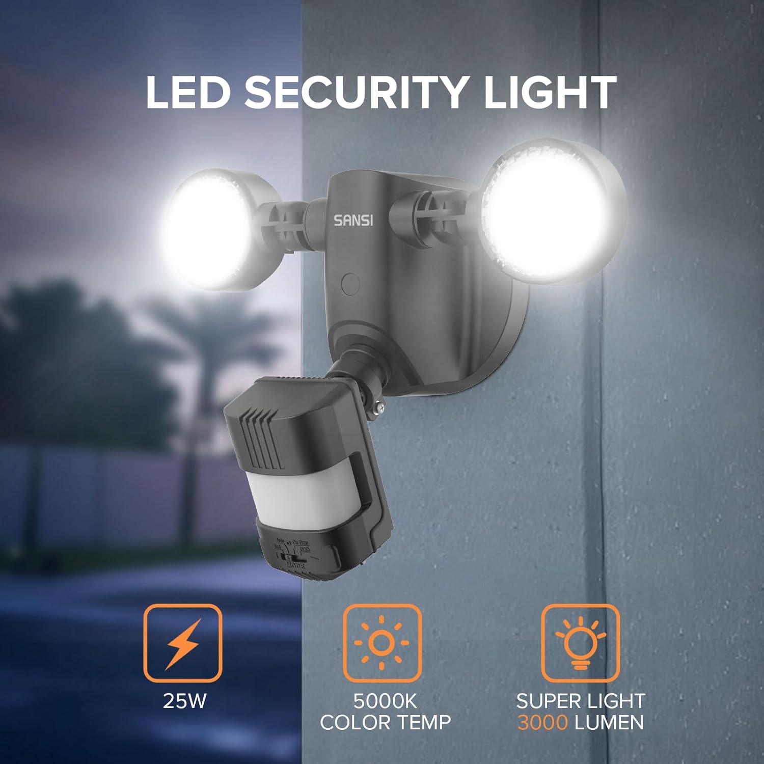 SANSI 25W 3000LM Motion Sensor Outdoor Security Lights, 5000K Daylight, Dusk to Dawn, 320° Angle Eave Mount Security Lights Super Bright for Yard, IP65 Waterproof, ETL Listed, Black