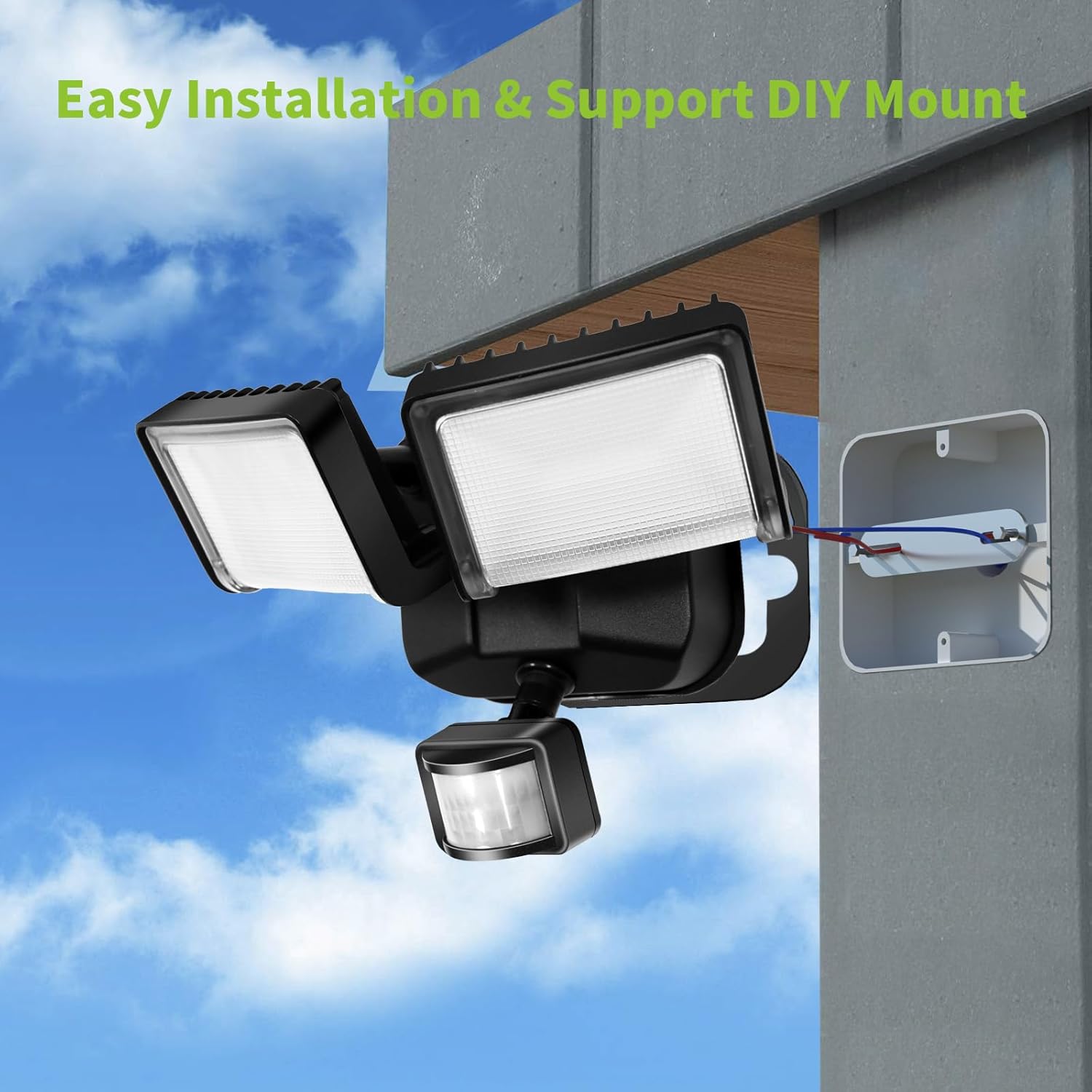 【360 °Adjustable Design & Easy Installation】: The heads of this outdoor security light can be adjusted 360°, allowing you to flexibly position the 2 LED heads and motion sensor to different angles based on your needs. Easy installation on the wall with a junction box through several simple wiring steps.