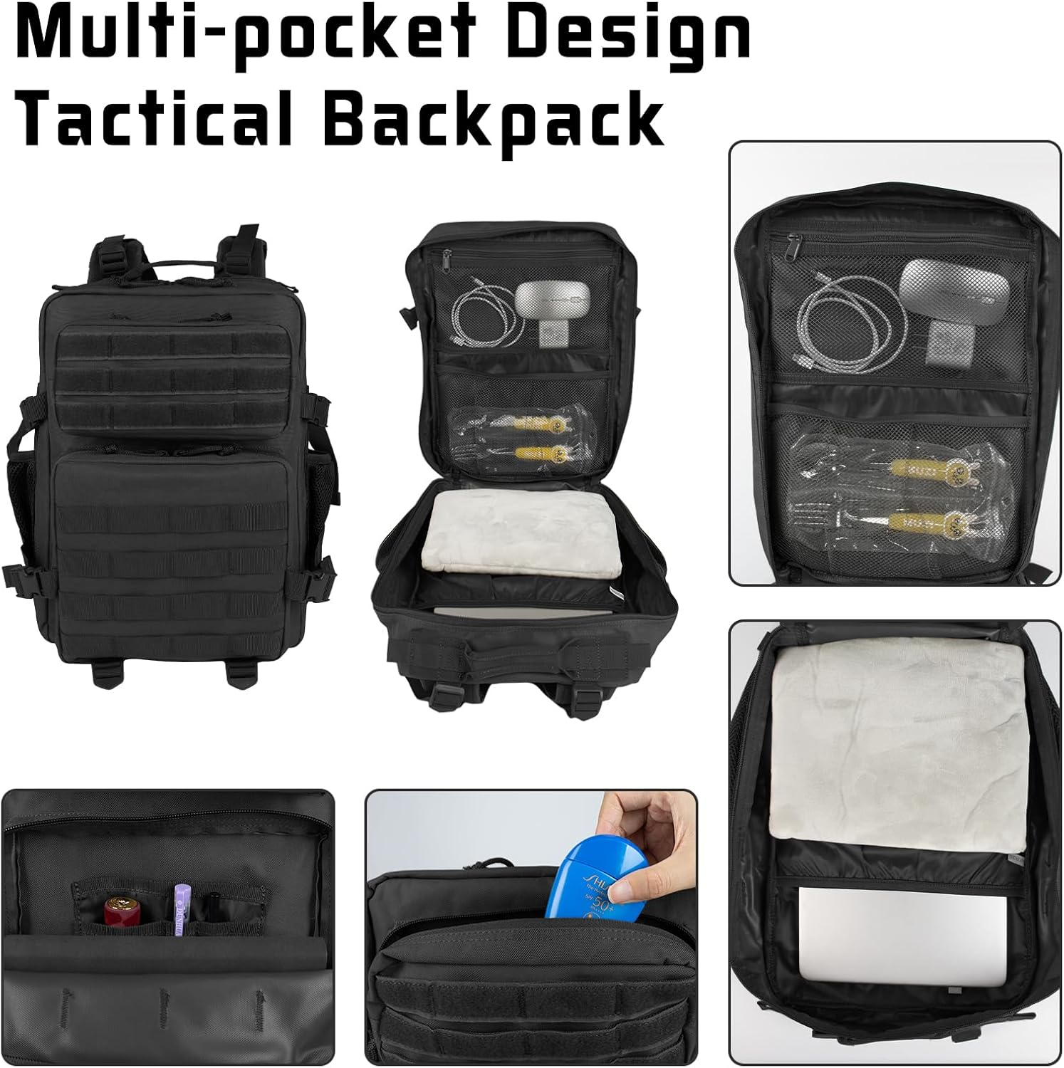 【Exquisitely designed】The travel backpack has two mesh side water bottle pockets that fit up to Bottles less than 3.1 inches in diameter. This backpack has so many storage areas and pockets, It includes a computer compartment and is a tactical computer backpack.It is perfect for taking a long with you on camping trips, hikes, to the gym, and on a plane as a carry on.