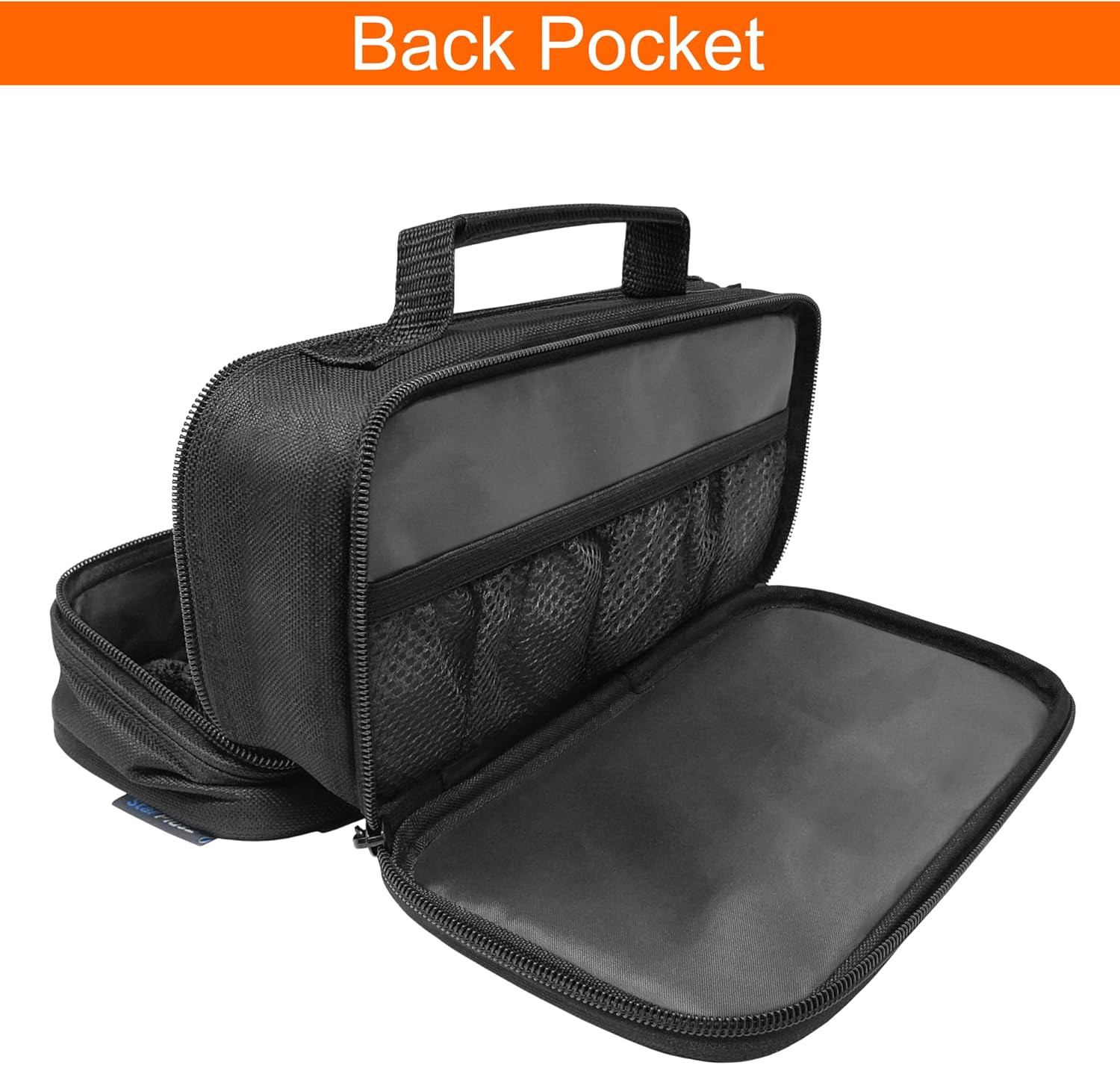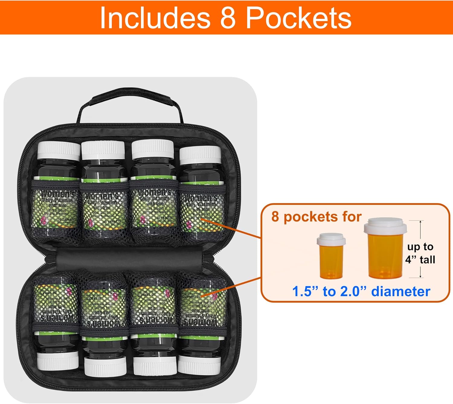 [Medicine Organizer] includes 8 individual pockets to hold bottles up to 2″ diameter x 4″ tall in the main compartment plus 1 large flat pocket inside the back compartment. FOR PROPER FIT – please measure your containers before ordering.