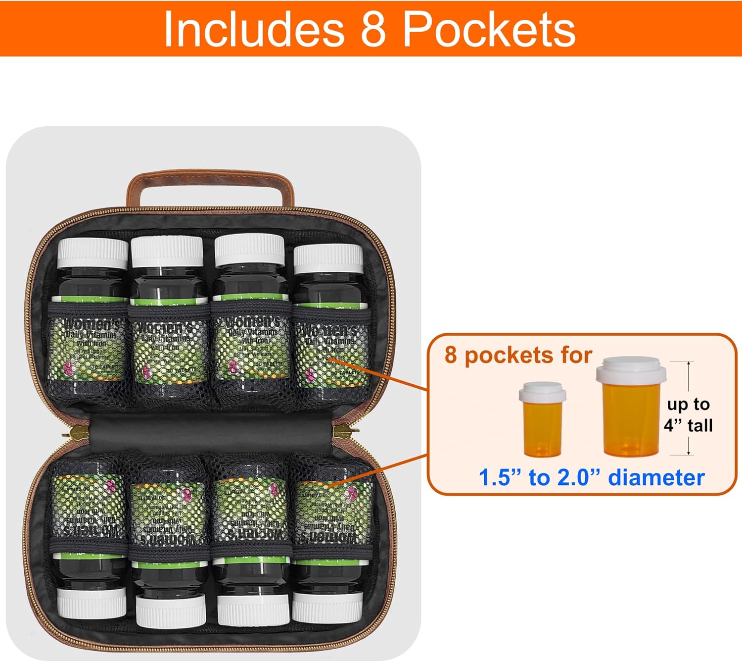 [Medicine Organizer] includes 8 individual pockets to hold bottles up to 2″ diameter x 4″ tall in the main compartment plus 1 large flat pocket inside the back compartment. FOR PROPER FIT – please measure your containers before ordering.