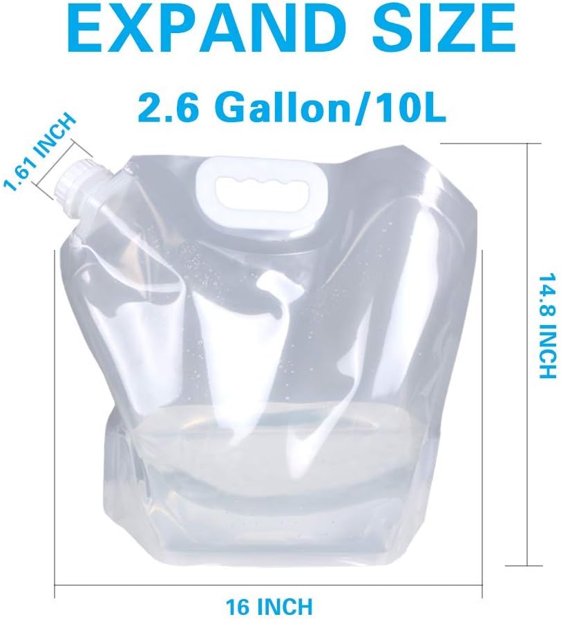 1.3 gallon (5L)/2.6gallon (10L) size. Easily folds or stores flat taking up little space. Stash several in your backpack when traveling or outdoors.