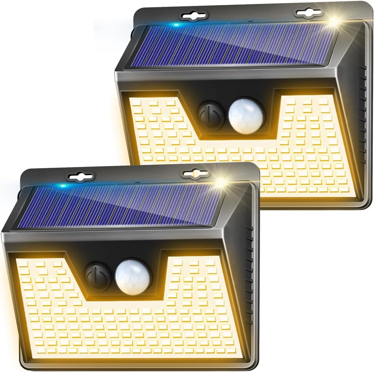 [Solar Security Lights]: With 140 brilliant LEDs, solar wall lights outdoor can provide a super bright illuminance for a wide area.Built in 2200mAh rechargeable Li-ion battery,this solar wall lights outdoor can light up about 8-10h after fully charged. This is a complete home security version, very suitable to meet your needs all night.