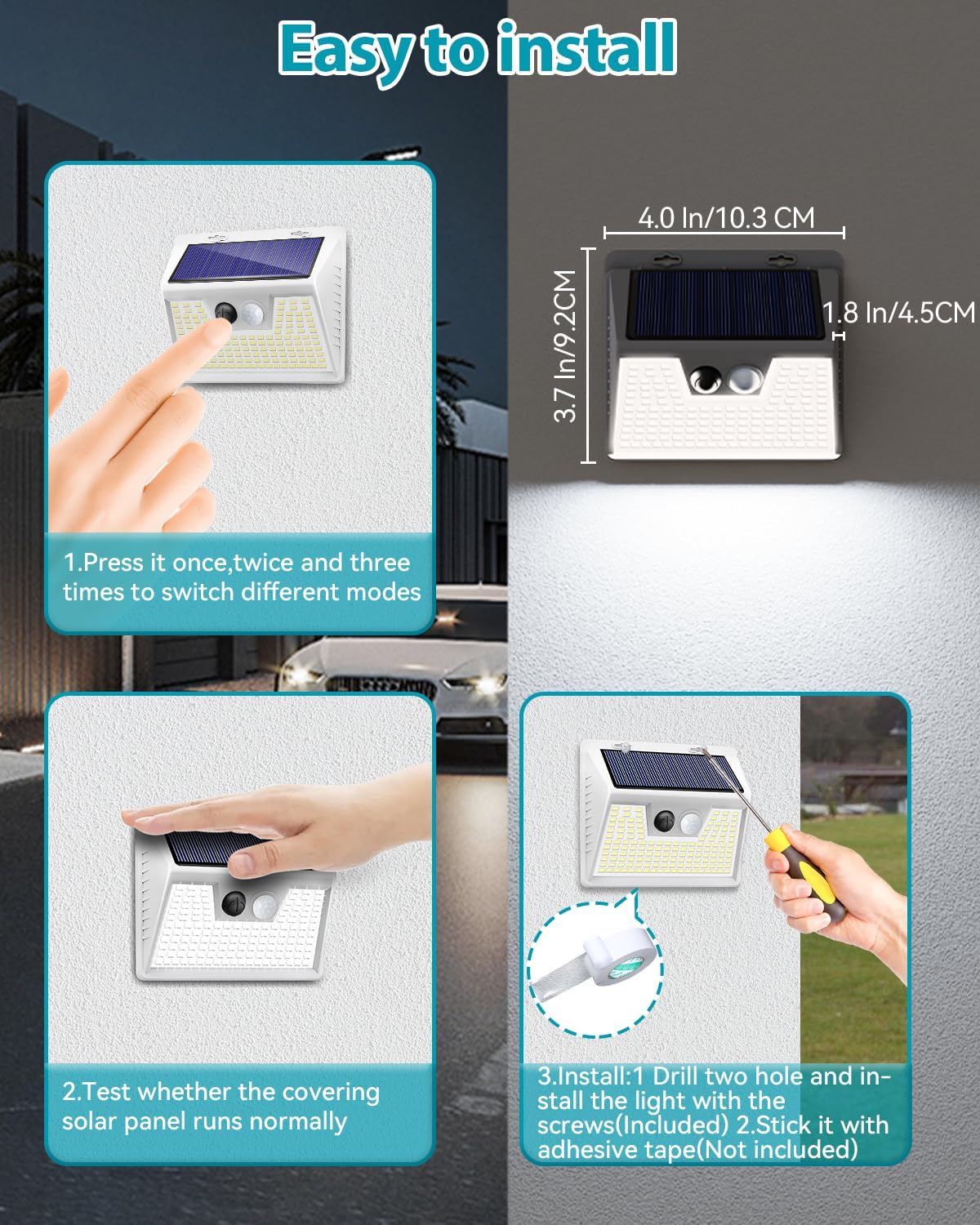 [Solar Security Lights]: With 140 brilliant LEDs, solar wall lights outdoor can provide a super bright illuminance for a wide area.Built in 2200mAh rechargeable Li-ion battery,this solar wall lights outdoor can light up about 8-10h after fully charged. This is a complete home security version, very suitable to meet your needs all night.