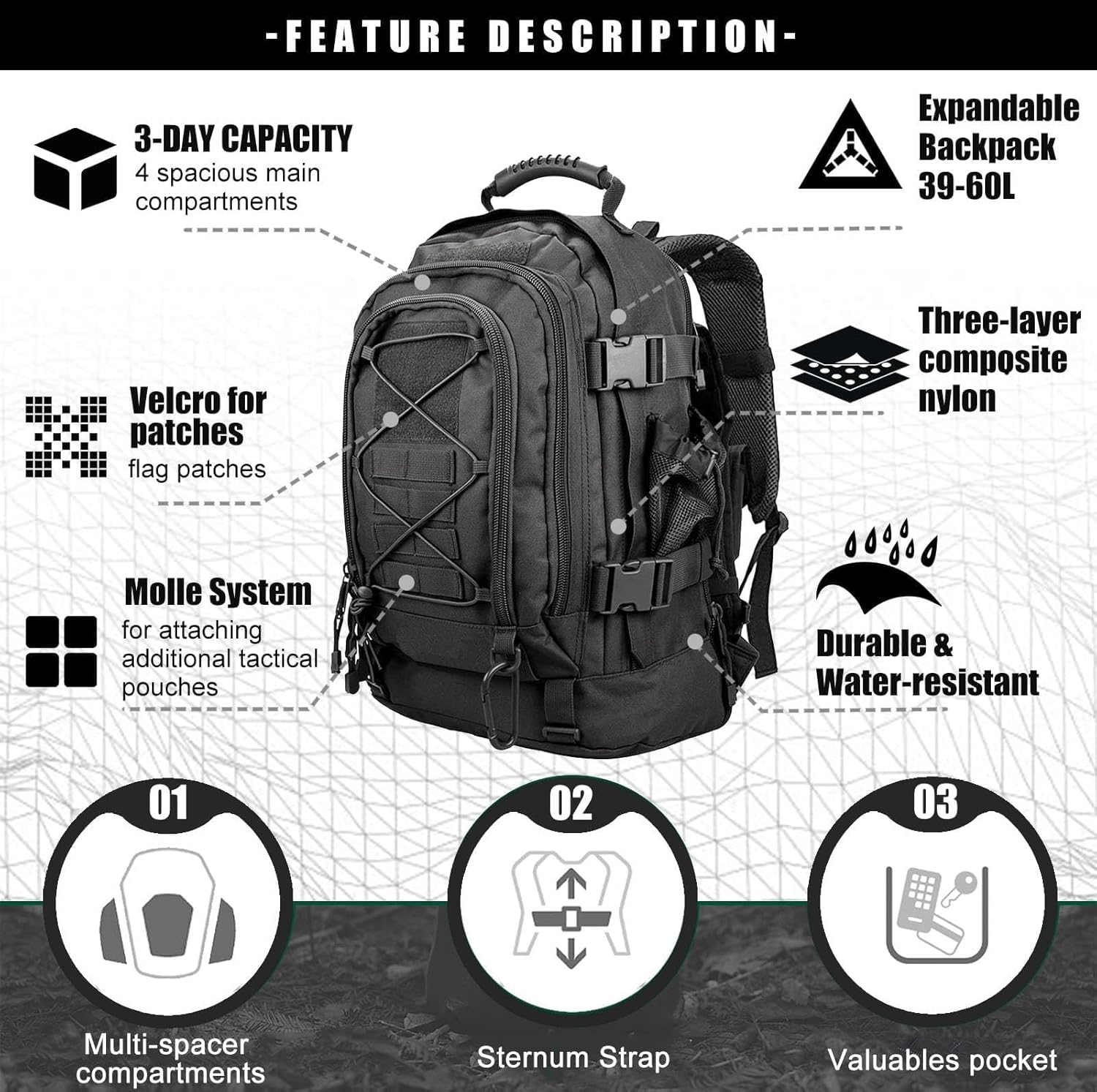 【Durable & Water-resistant Tactical Backpack】With double zipper closure, it is made of high-density double-stitched 600D nylon fabric for durability and water resistance.The shell is tough and water-resistant and stitched with reinforced nylon threads.