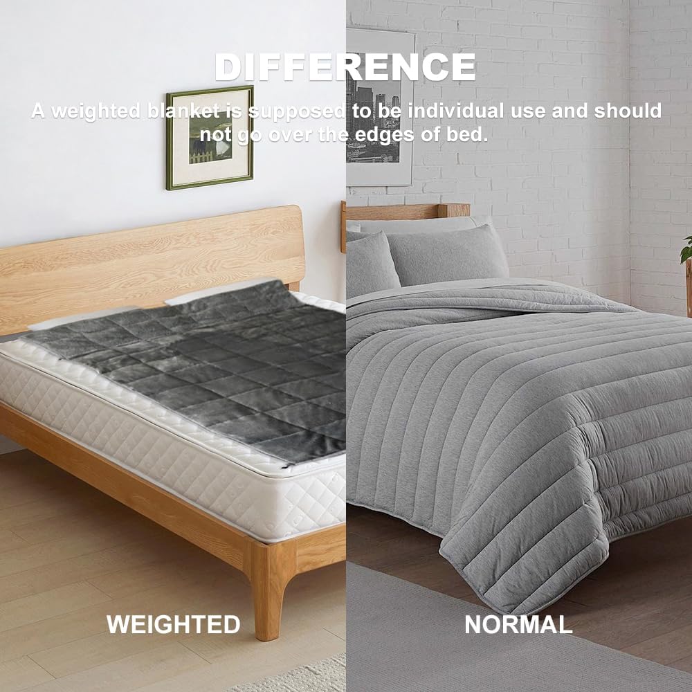 SUGGESTED WEIGHT & SIZE: Choose a blanket that weighs about 7%-13% of your body weight. Weighted blankets are intended for individual use and should not extend over the edges of the bed. This is why twin, queen, or king-size weighted blankets are smaller than standard blankets of the same bed size.