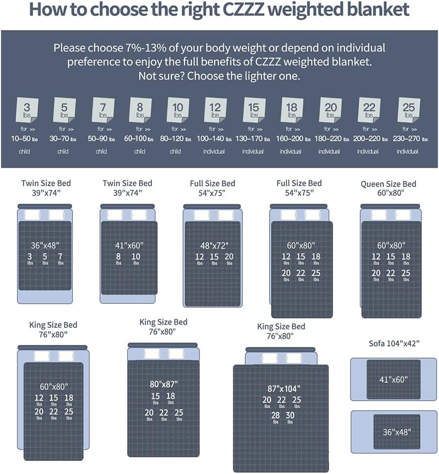 INSTRUCTION & PRECAUTIONS: The CZZZ Weighted Blanket can be used in various ways: covering the body for rest, wrapping around the shoulders, or laying across the lap or legs while reading, relaxing, napping, or watching TV. The blanket should never cover the head. It is not suitable for pregnant women, individuals with physical weakness, or those with specific health conditions.