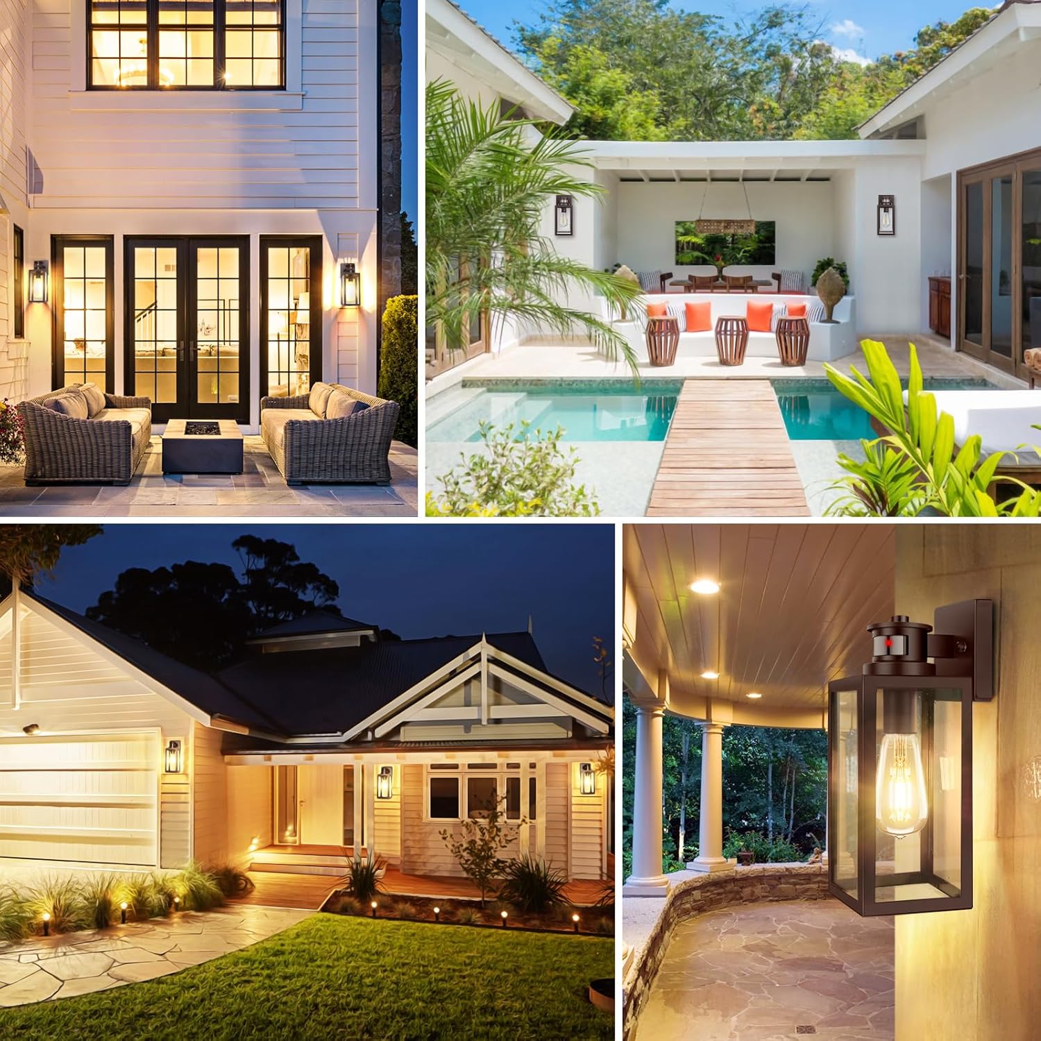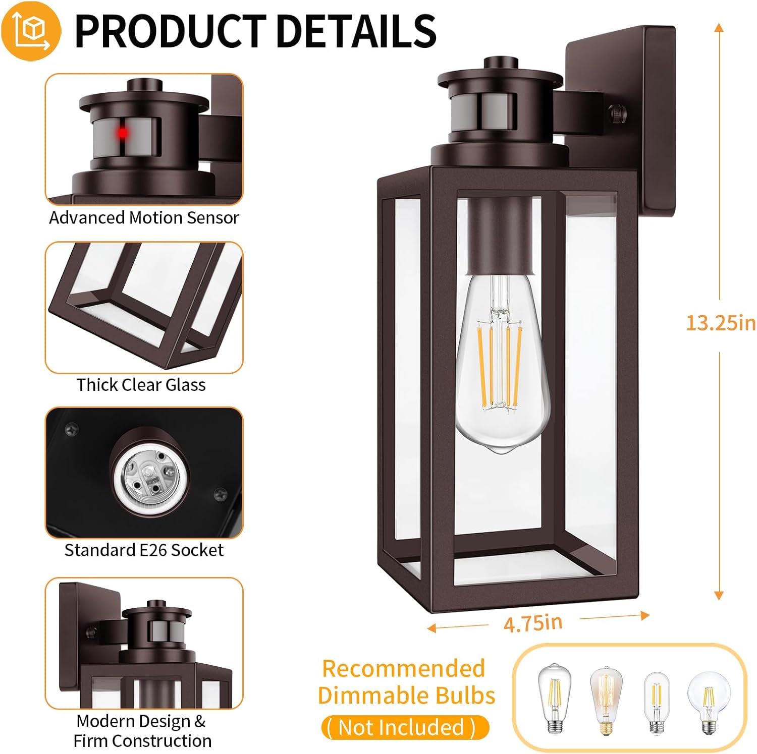 【Waterproof &Anti-rust Well-Made】Our motion sensor outdoor lanterns are made by metal and aluminum in stylish brown finish and sturdy clear glass, can be greatly used for years and endure any environment, being resistant for all weathers: rain or snow, ultra high or low temperatures. You will not worry these exterior lights for house will be rusted or corroded anymore.
