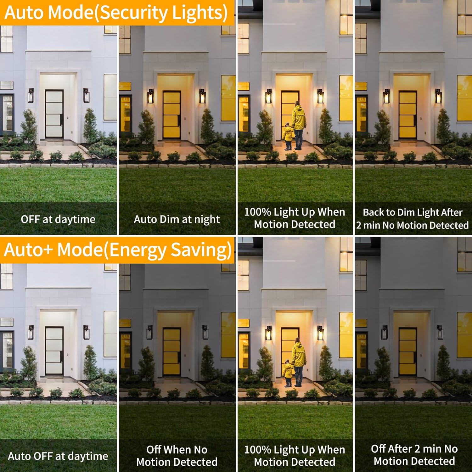 【Practical Three Modes】Offering 3 modes for your lighting. For Auto mode, these outdoor lights for house will auto on at dusk with 20% brightness, turn into full brightness once motion is detected, auto dim again after about 2 min with no movement. With Auto+ mode, these light fixtures will only light up when motion detected. These motion sensor wall lights also come with manual mode that enables to be on at full brightness for 8 hrs. These 3 modes can be easily changed by your wall switch.