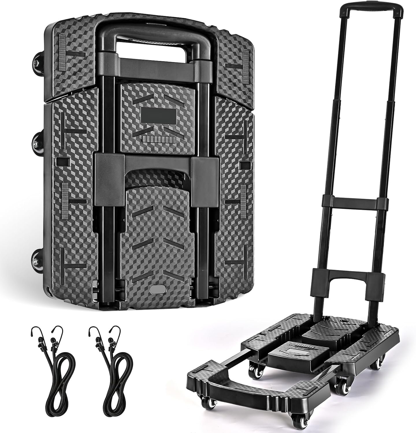[Stable and Quiet] Our cart’s handle is made of premium alloy, offering great stability and resistance to bending and wobbling. The platform is crafted from impact-resistant materials, making it lightweight yet sturdy. The tires are made from durable rubber, suitable for various surfaces and low in noise. Two detachable bungee cords are included to boost your efficiency