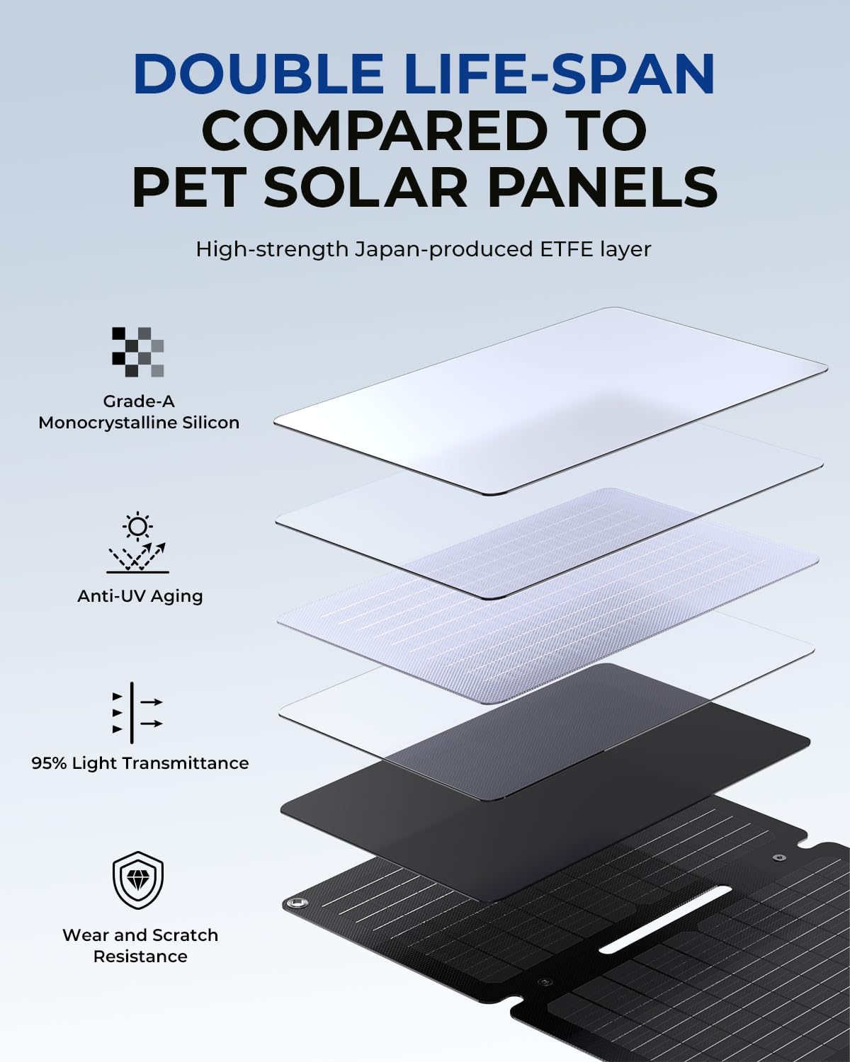 Special ETFE surface protects this solar panel from occasional rain in unexpected weather, it comes with a higher grade water resistance and dust protection than other solar chargers.(Junction box is not waterproof)