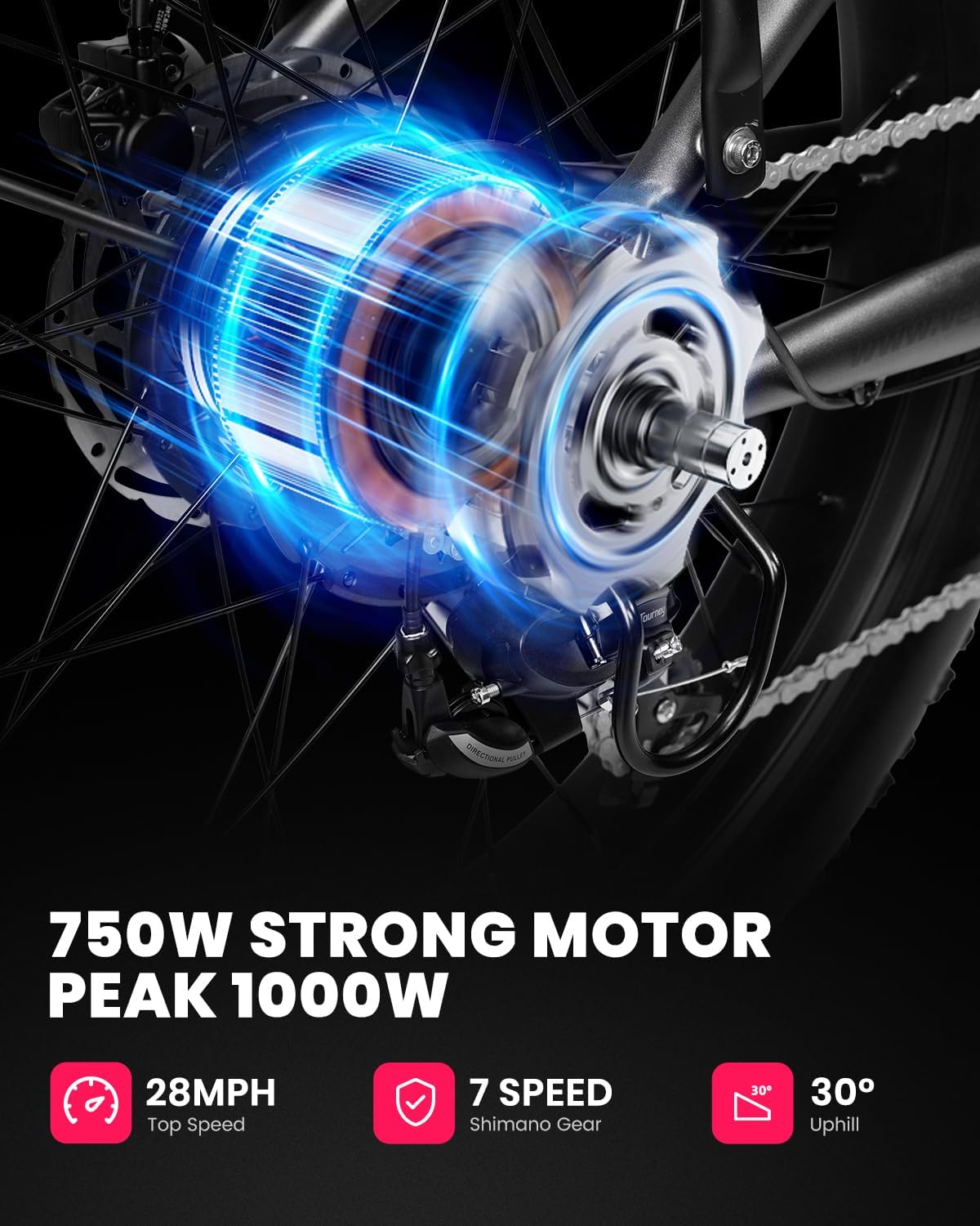 【Powerful Motor & 3 Riding Modes】This step-over electric bike is equipped with a powerful 750W (Peak 1000W) rear motor, capable of reaching a maximum speed of 28MPH with pedal assist and 20MPH with throttle. It offers 3 riding modes: pure electric, pedal assist, and classic bike. You can choose the mode that best suits your needs.