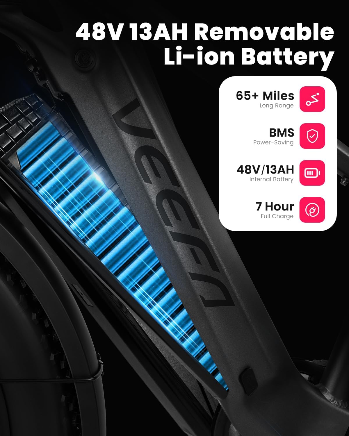 VEEFA Electric Bike 750W/Peak 1000W Motor 48V 13AH Removable Battery Electric Bicycle for Adults 26″ x 4.0″ Fat Tire Ebike 28MPH E Bike 7-Speed UL 2849 Certified