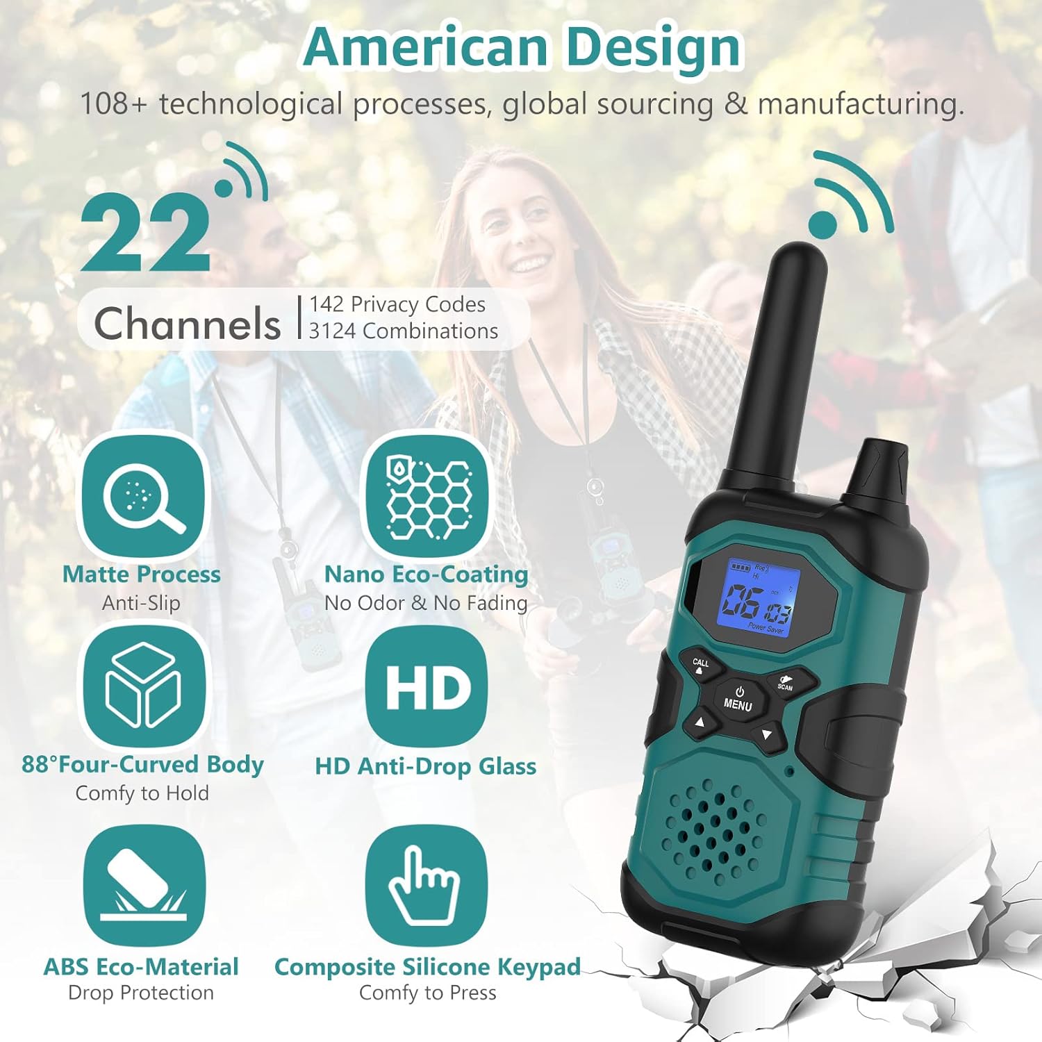 【Proudly American Tech & Design】:Advanced walkie-talkies are trusted by millions of people worldwide. Our global sourcing and manufacturing culminate in a product that stands testament to American ingenuity and quality. Experience our walkie talkies’ world-class design & functionality, such as Smart control system(Auto squelch,Auto memory,Auto scanning,Auto power saving,Low battery alert), iVOX hands-free, Drop-protection, 22 channels(142 privacy codes), Compatible with FRS devices, NOAA Service
