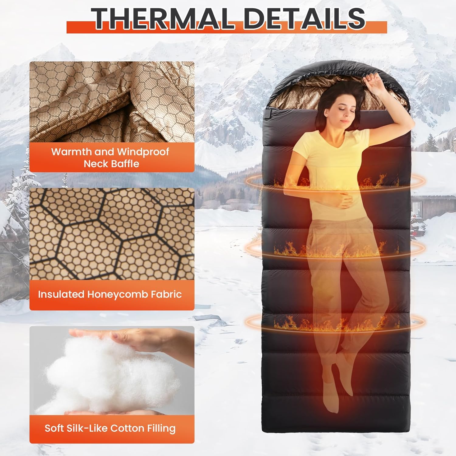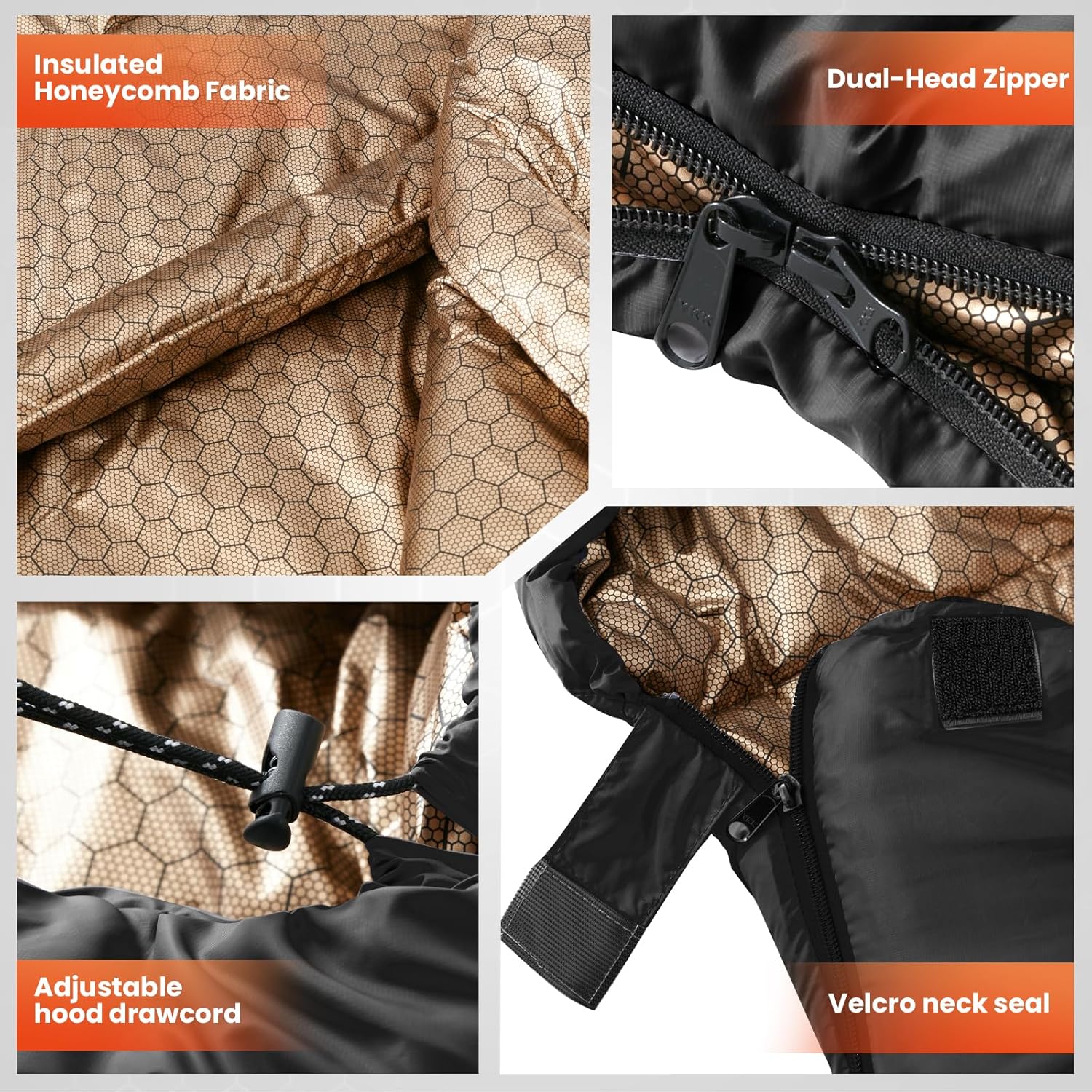 Sleeping Bag Details: Velcro at the neck to prevent heat loss, adjustable drawstring at the head to tighten the collar, fully expanded dimensions: (74.8”+11.8”)*74.8”