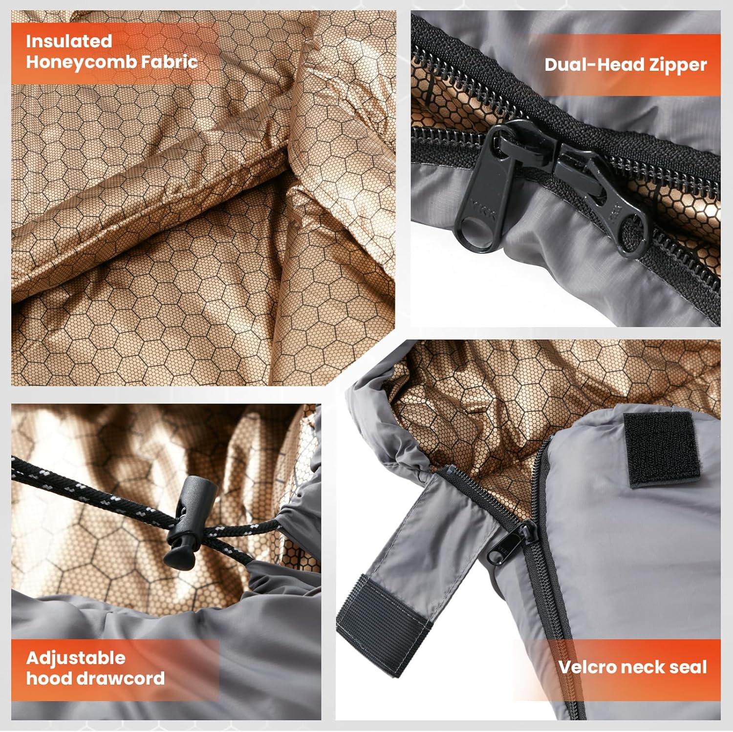 Sleeping Bag Details: Velcro at the neck to prevent heat loss, adjustable drawstring at the head to tighten the collar, fully expanded dimensions: (74.8”+11.8”)*74.8”