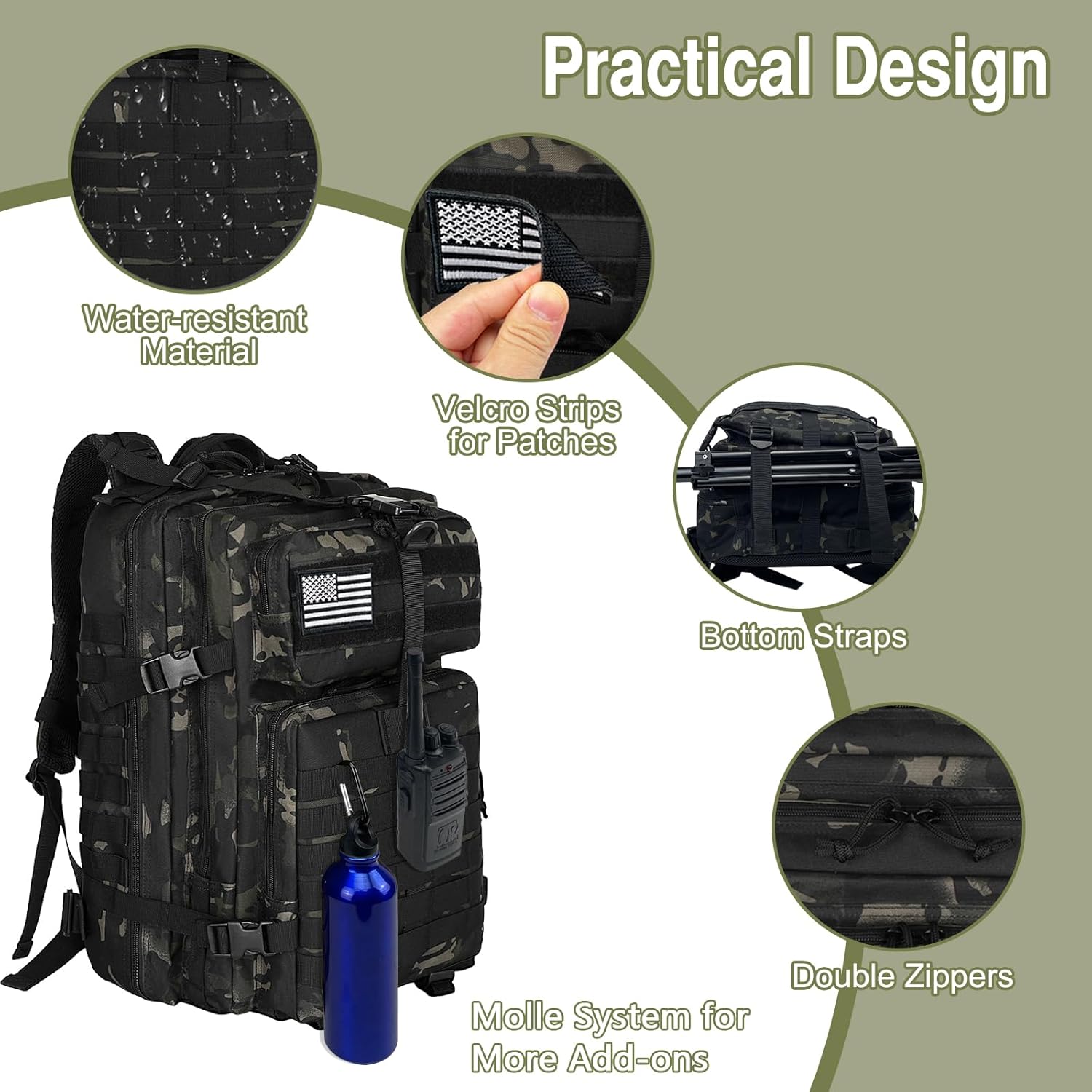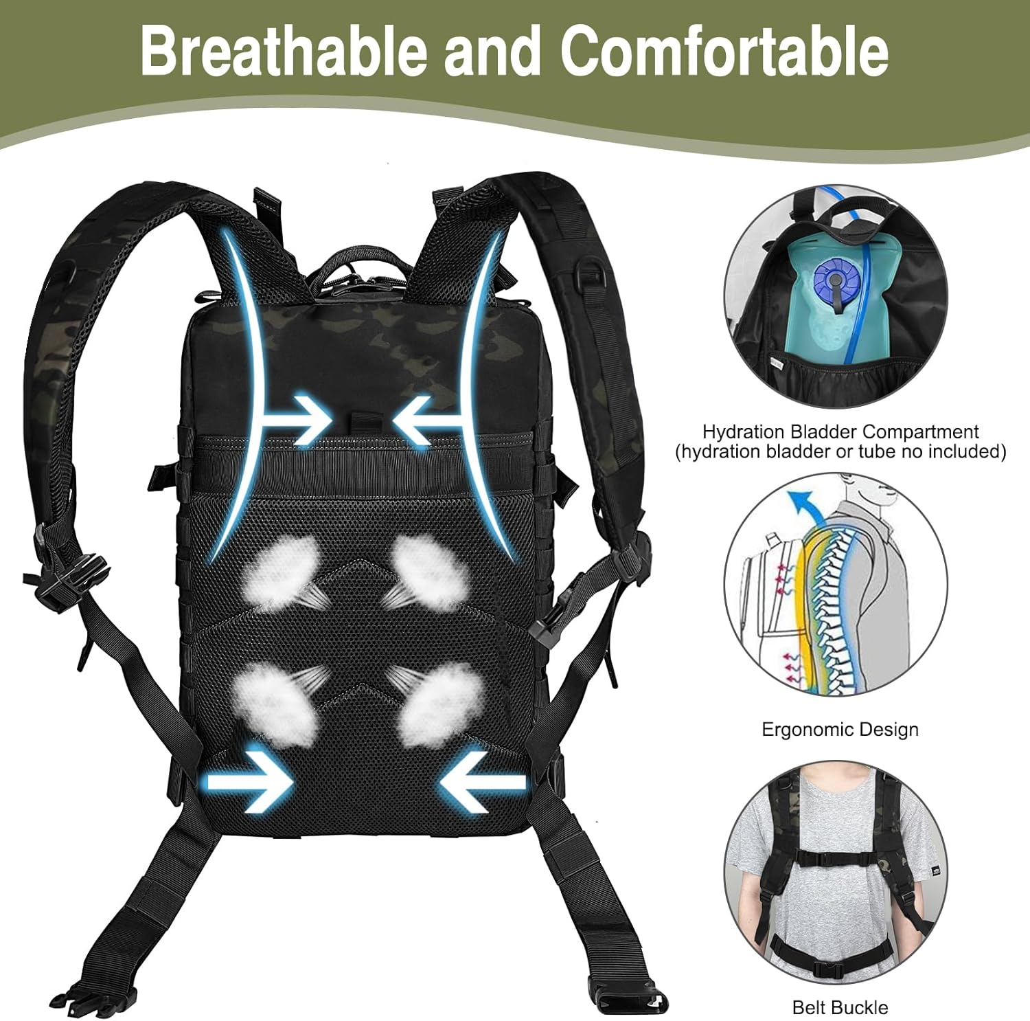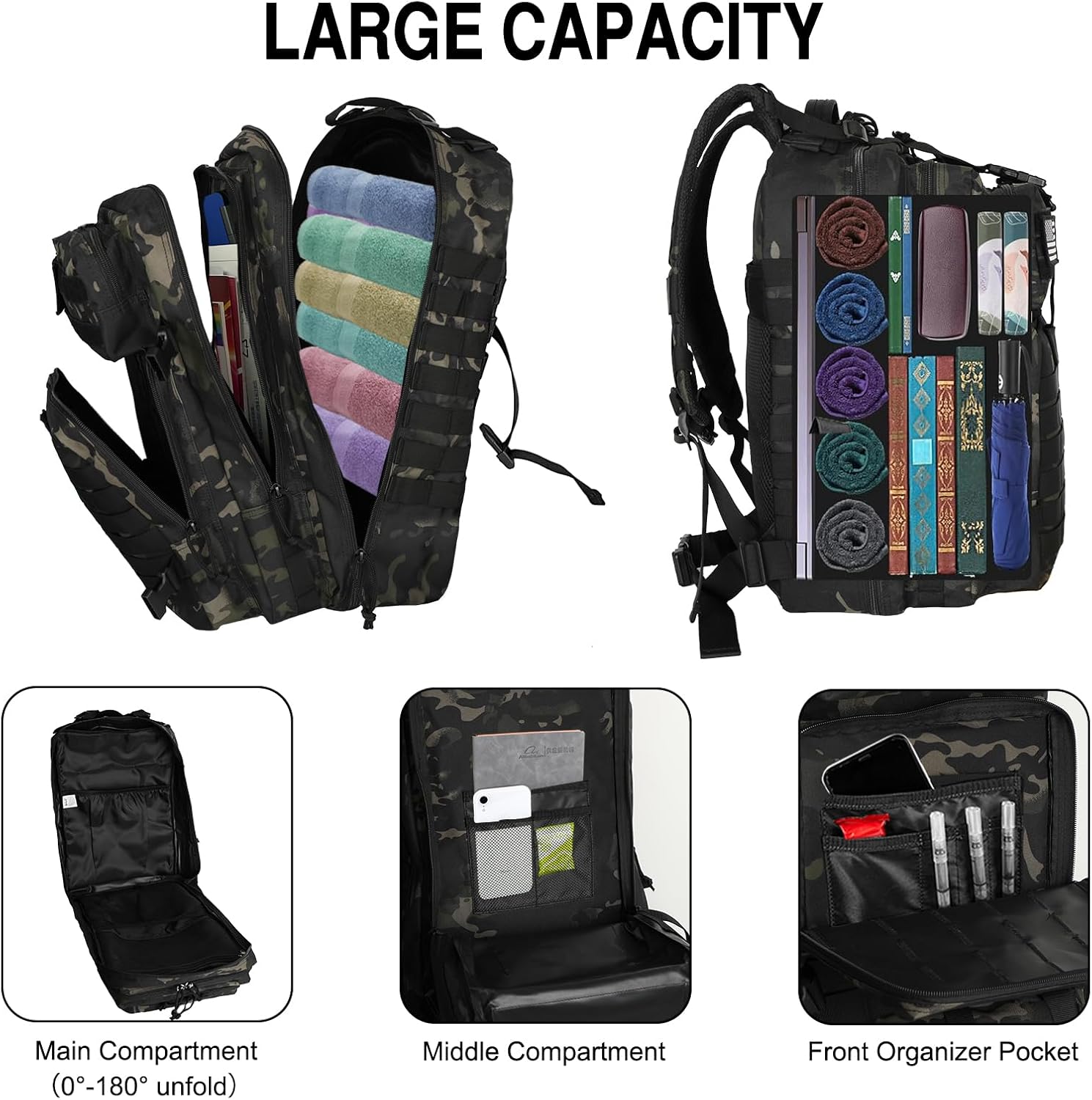 [MULTI-FUNCTIONAL]: This military backpack is hydration-compatible, ready to accommodate a hydration bladder (not included), ideal for camping, hiking, and other outdoor activities. It can also serve as a 3-day assault pack, survival kit, army bag, bugout bag, trekking pack, range bag, or gym bag