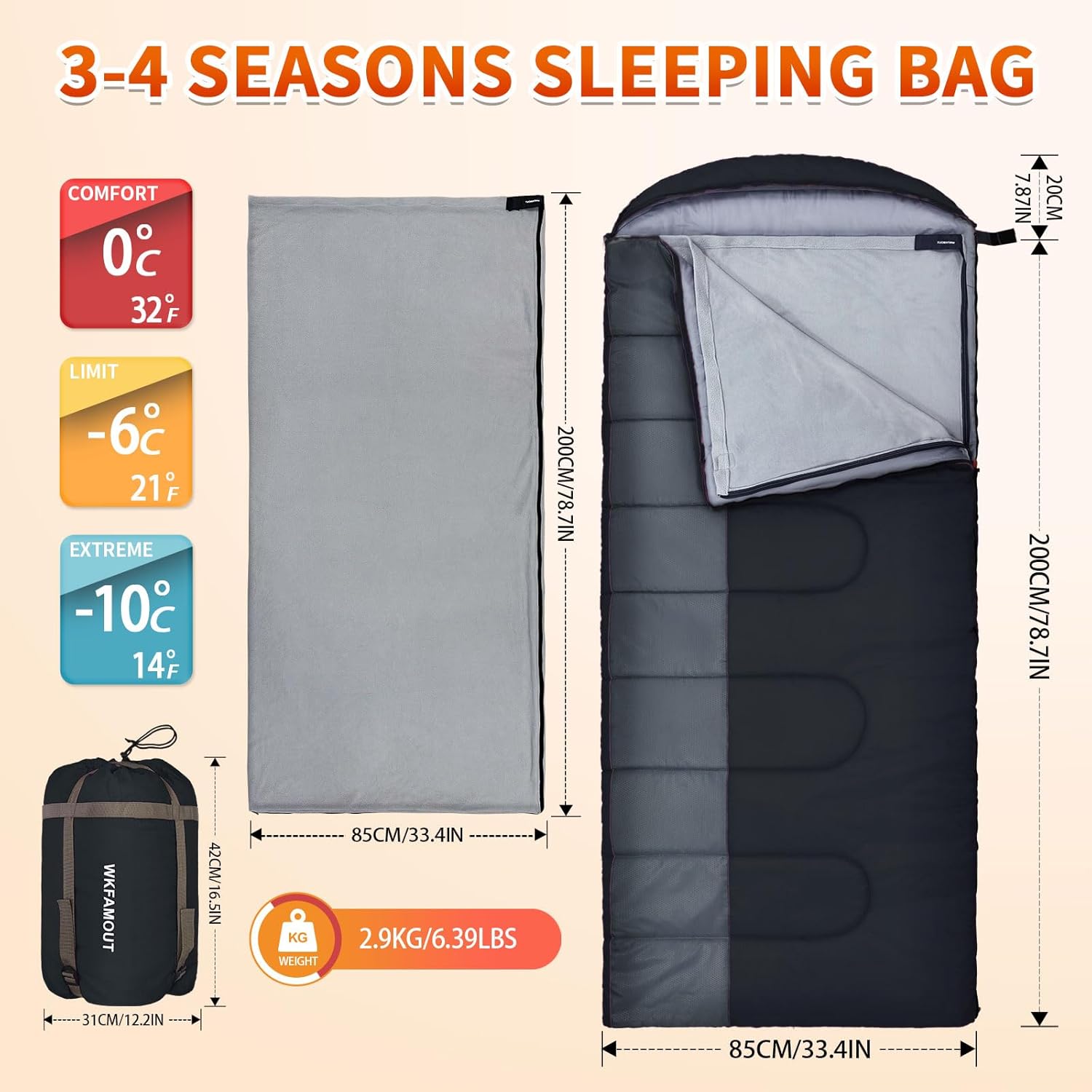 2 IN 1 SLEEPING BAG: This sleeping bag is filled with 350GSM soft cotton,the sleeping bag liner 190GSM is made of thicker and breathable polar fleece. With a comfort temperature rating of 32°F/0°C, it ensures a warm night’s sleep even in winter camping