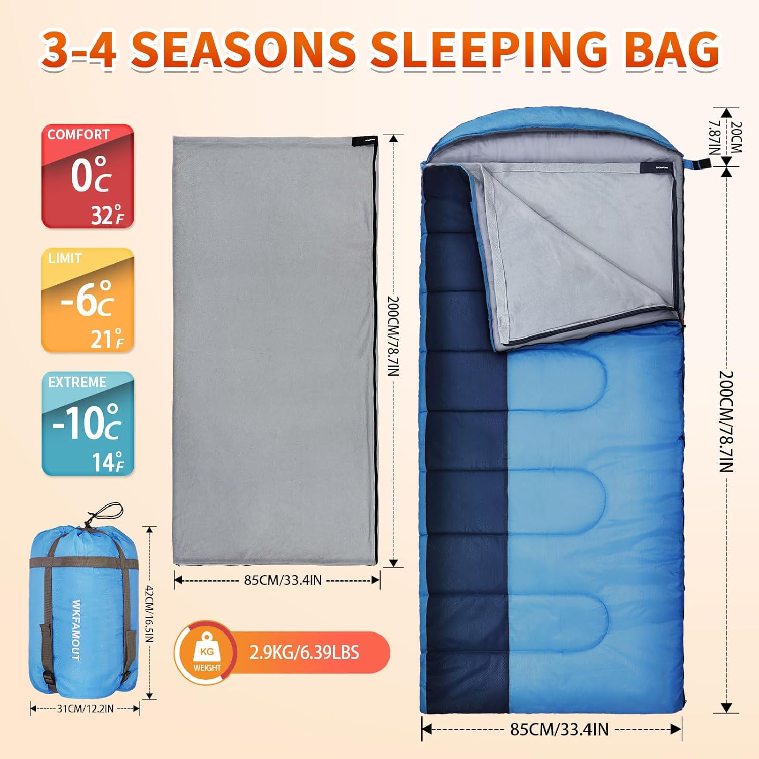 2 IN 1 SLEEPING BAG: This sleeping bag is filled with 350GSM soft cotton,the sleeping bag liner 190GSM is made of thicker and breathable polar fleece. With a comfort temperature rating of 32°F/0°C, it ensures a warm night’s sleep even in winter camping